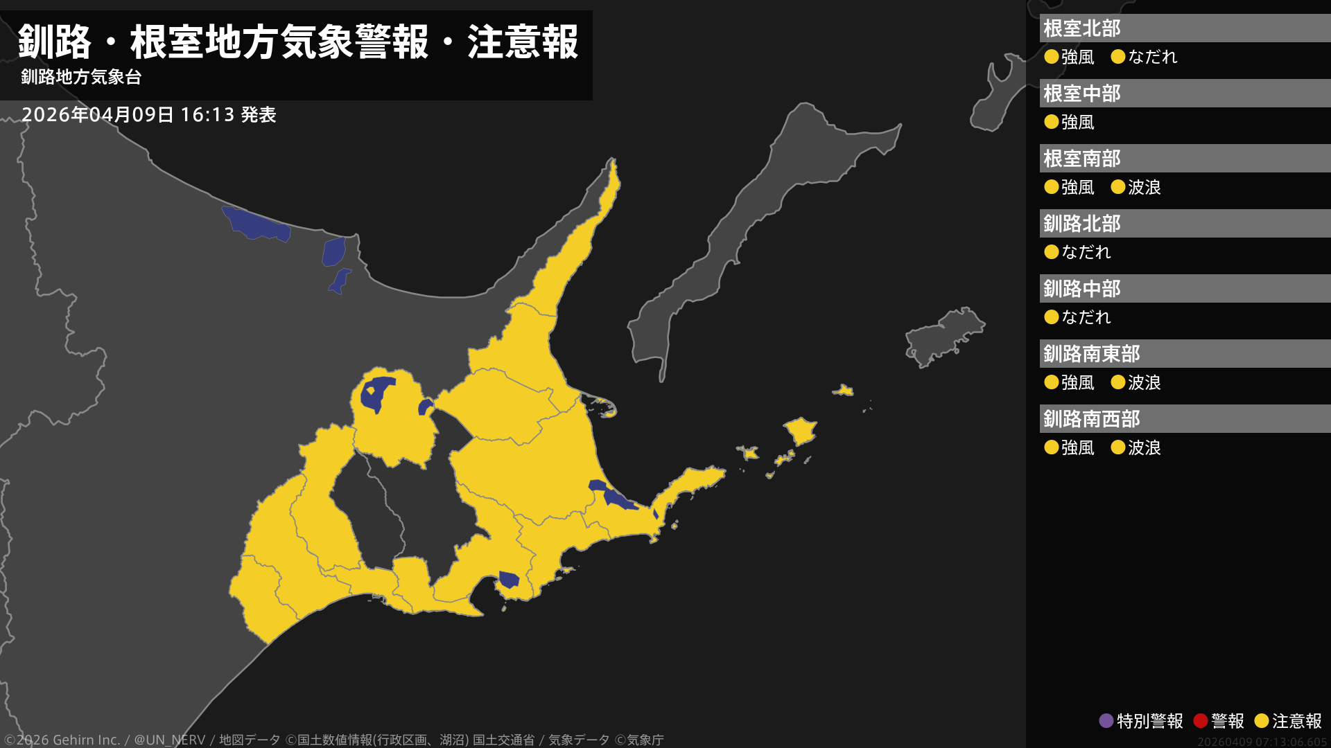 【釧路・根室地方 気象警報・注意報 2026年04月09日 16:13】根室、釧路地方では、9日夜遅くまで強風に、10日明け方まで高波に、11日までなだれに注意してください。#気象警報注意報 #根室地方 #釧路地方