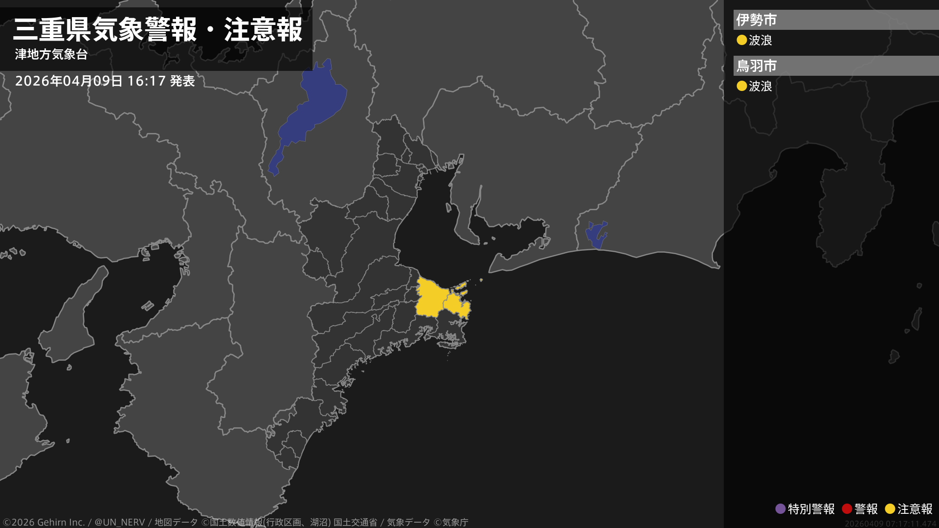 【三重県 気象警報・注意報 2026年04月09日 16:17】南部では、10日未明から高波に注意してください。#気象警報注意報 #三重県