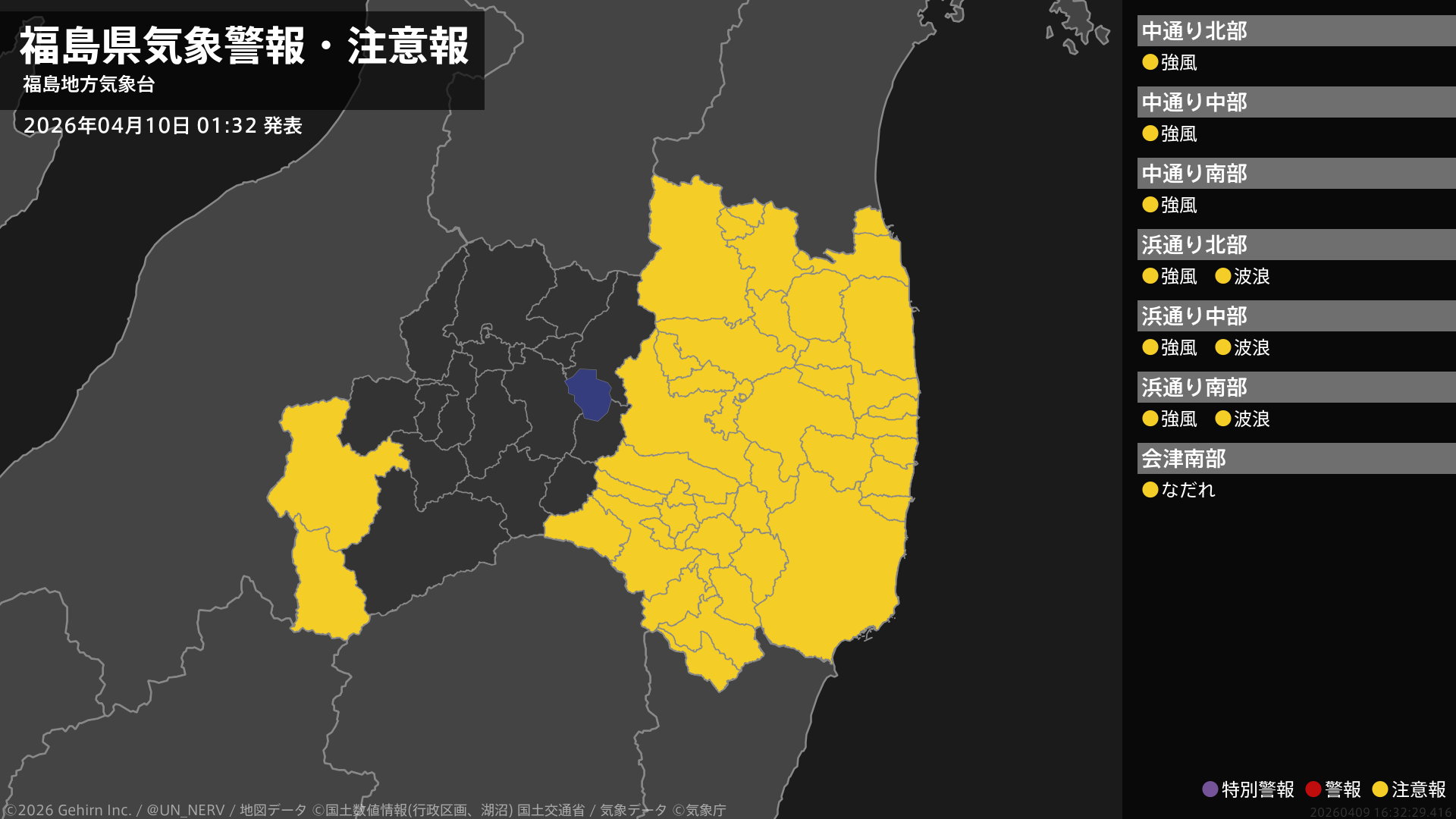 【福島県 気象警報・注意報 2026年04月10日 01:32】中通り、浜通りでは、強風に注意してください。浜通りでは、高波に注意してください。会津では、なだれに注意してください。#気象警報注意報 #福島県