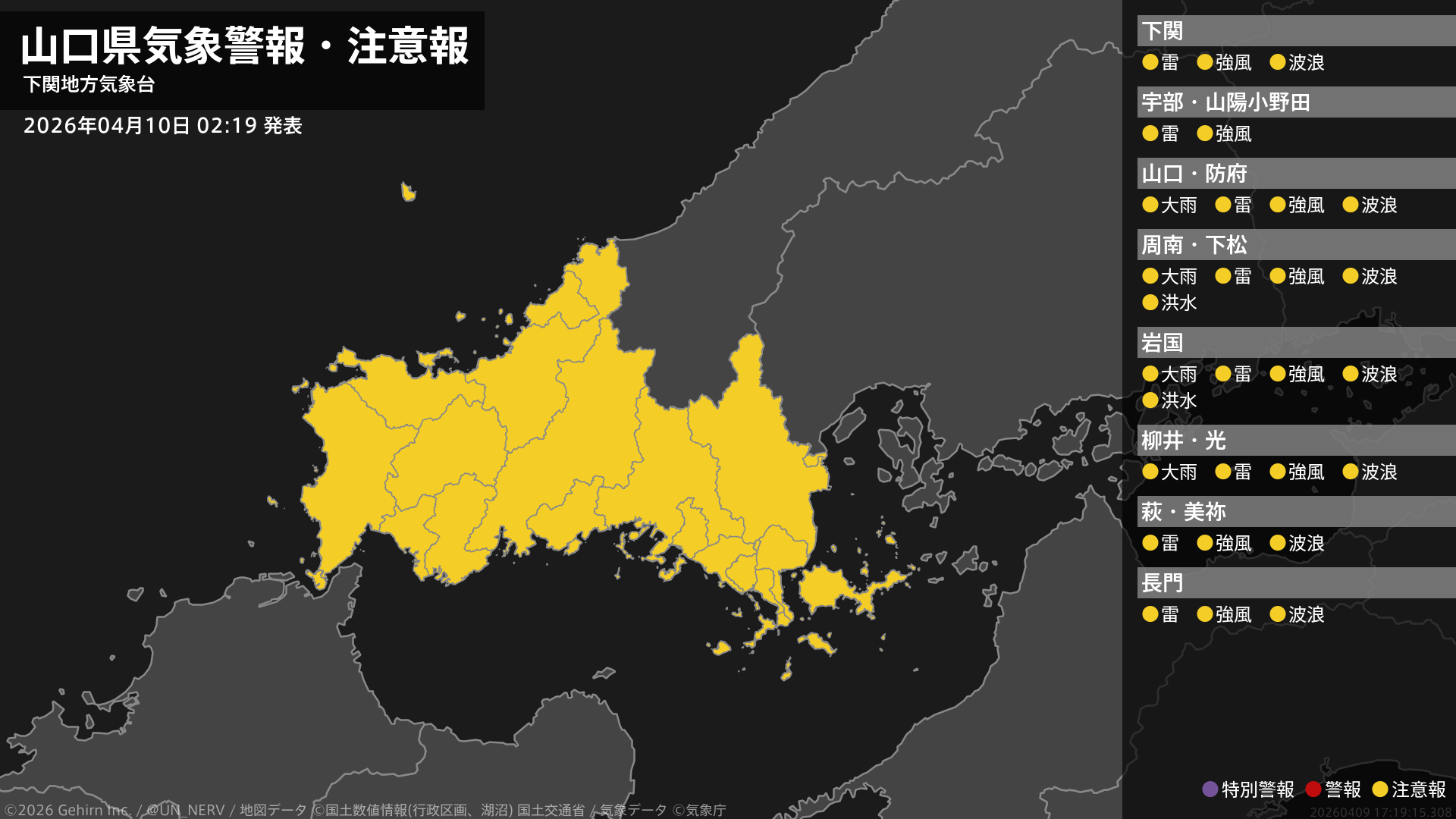 【山口県 気象警報・注意報 2026年04月10日 02:19】中部、東部では、土砂災害や低い土地の浸水、河川の増水に注意してください。山口県では、強風や高波、竜巻などの激しい突風、落雷に注意してください。#気象警報注意報 #山口県