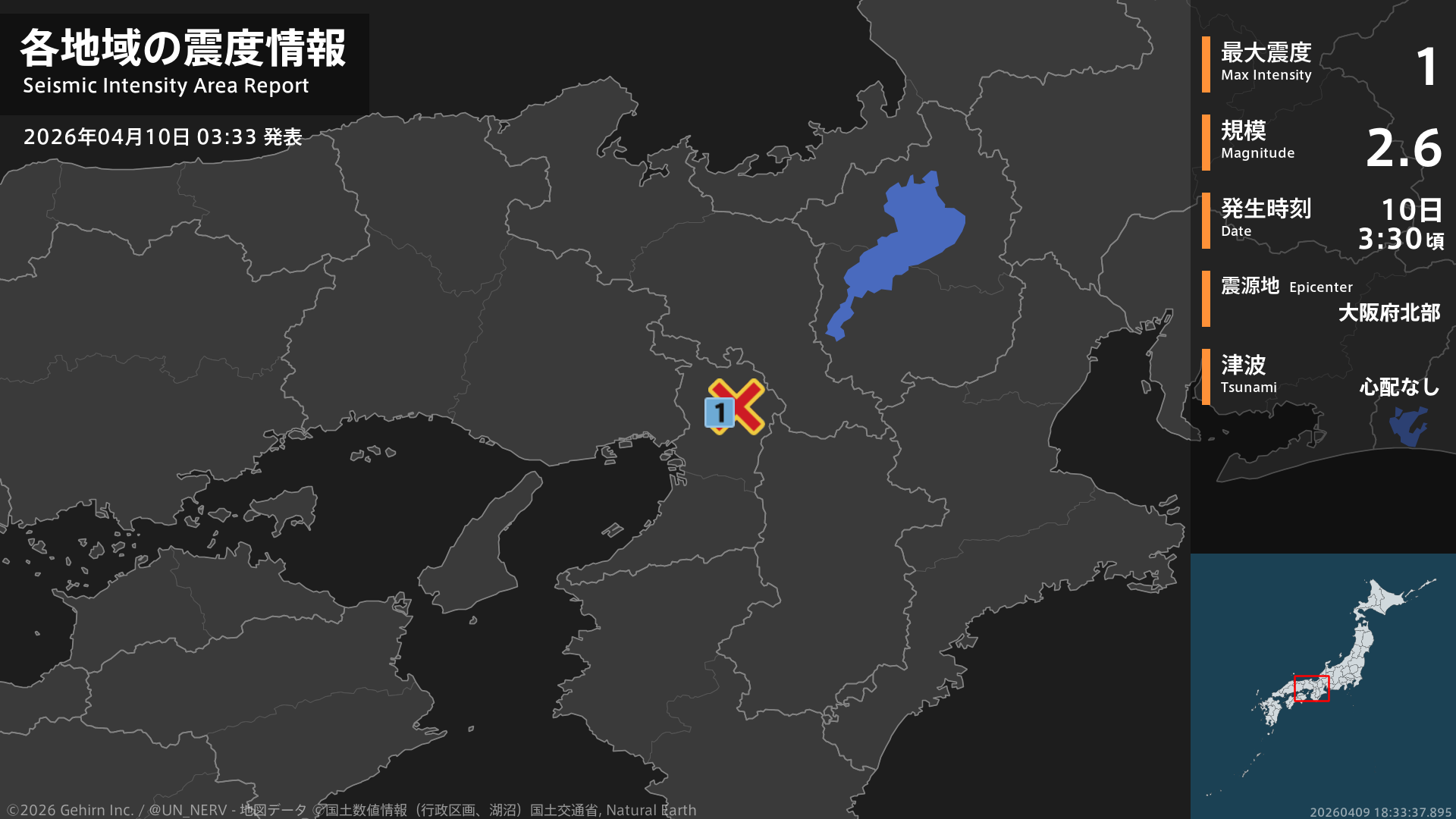 【地震情報 2026年4月10日】3時30分頃、大阪府北部を震源とする地震がありました。震源の深さは約10km、地震の規模はM2.6、最大震度1を大阪府で観測しています。この地震による津波の心配はありません。#地震 #大阪府