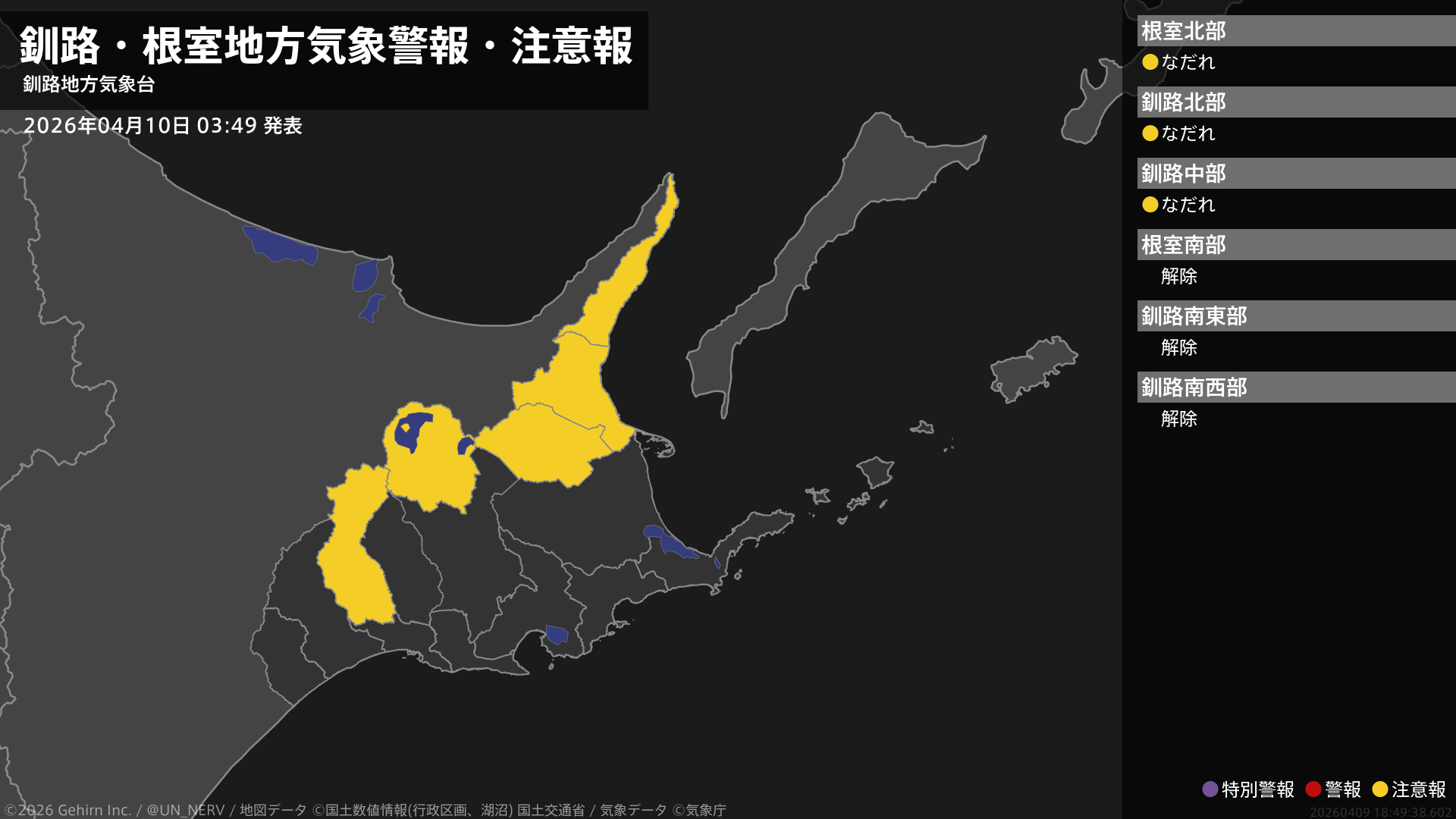 【釧路・根室地方 気象警報・注意報 2026年04月10日 03:49】根室、釧路地方では、11日までなだれに注意してください。#気象警報注意報 #根室地方 #釧路地方