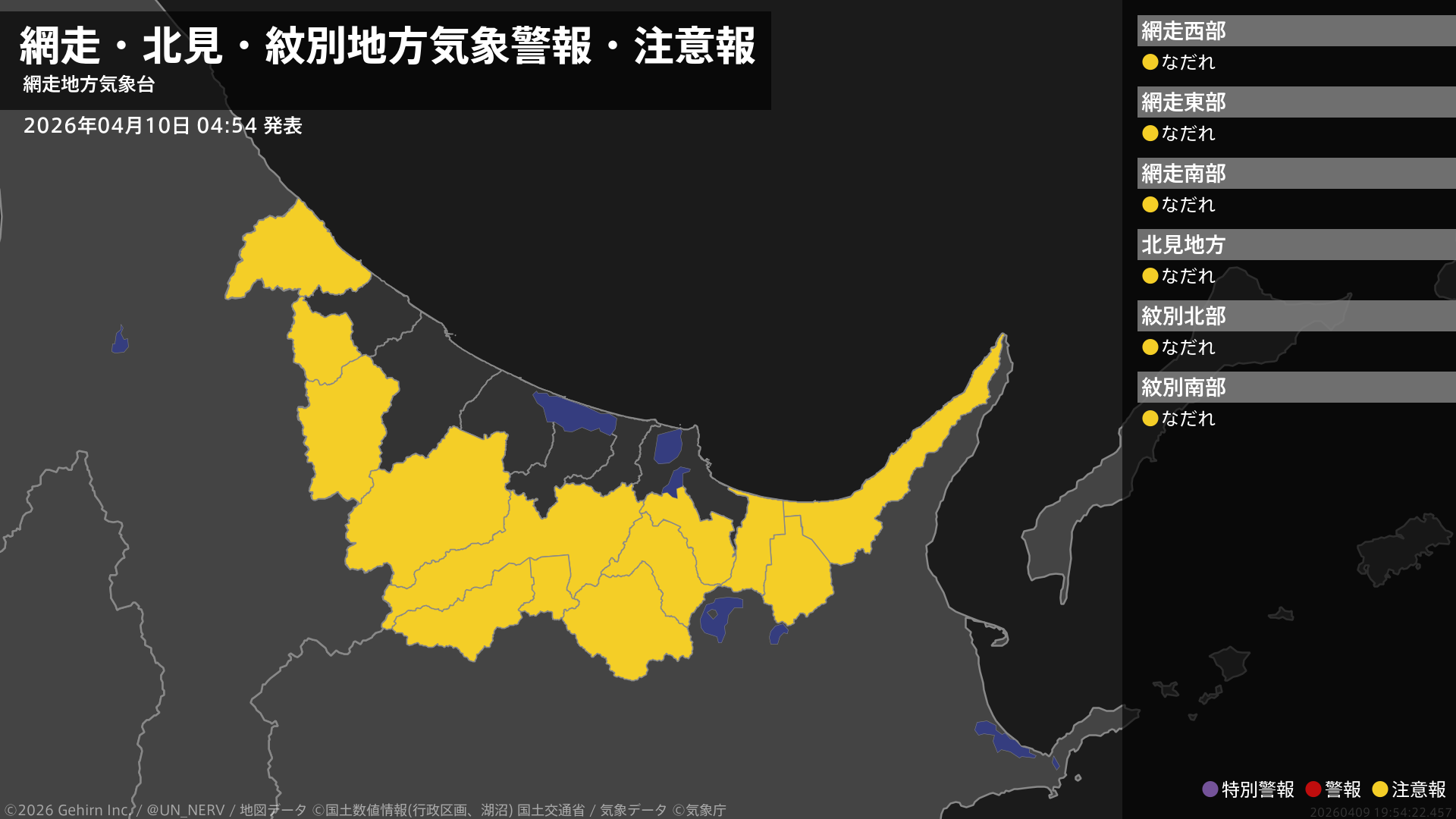 【網走・北見・紋別地方 気象警報・注意報 2026年04月10日 04:54】網走、北見、紋別地方では、11日までなだれに注意してください。#気象警報注意報 #網走・北見・紋別地方