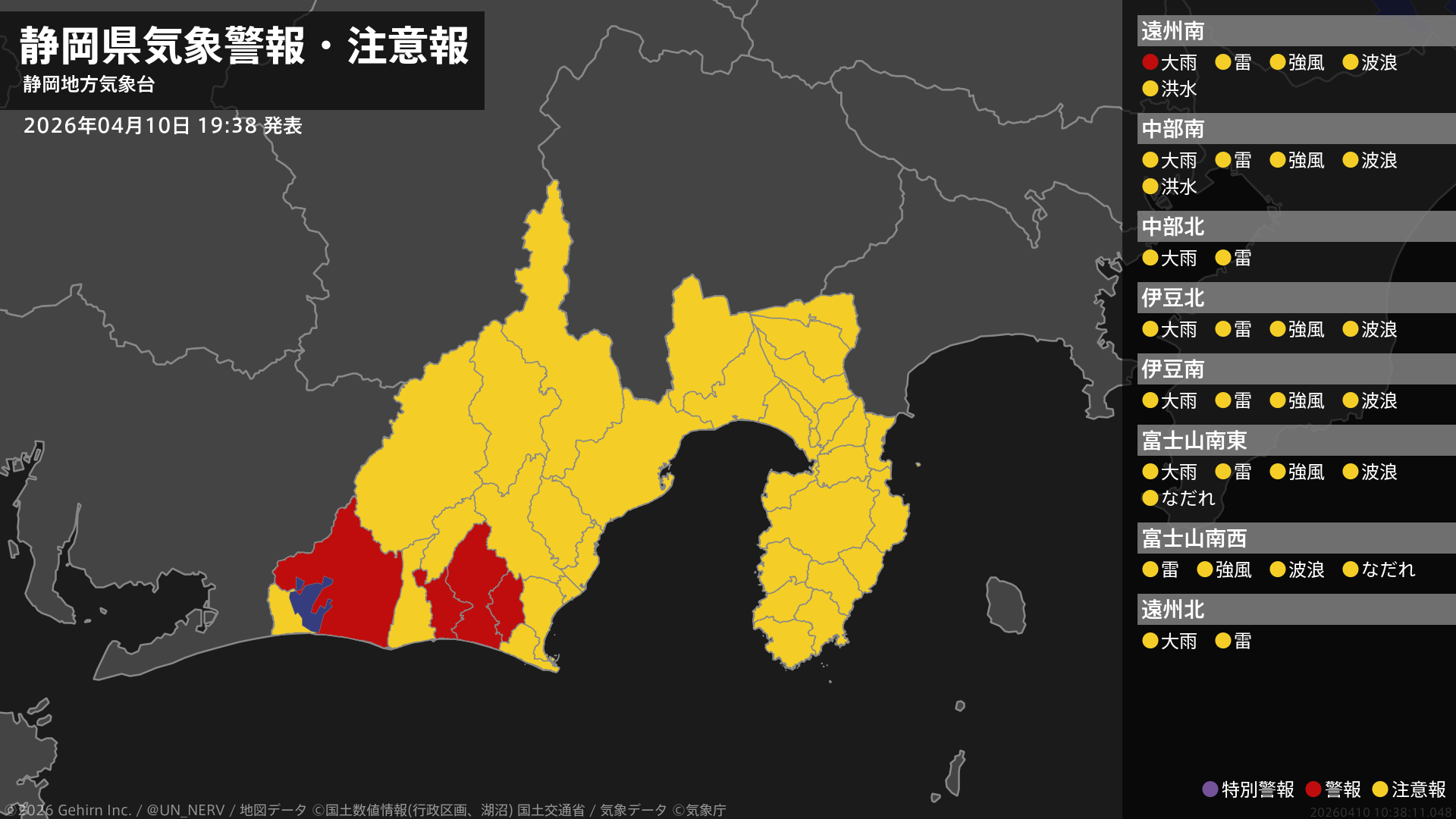 【静岡県 気象警報・注意報 2026年04月10日 19:38】西部では、10日夜遅くまで土砂災害に警戒してください。#気象警報注意報 #静岡県