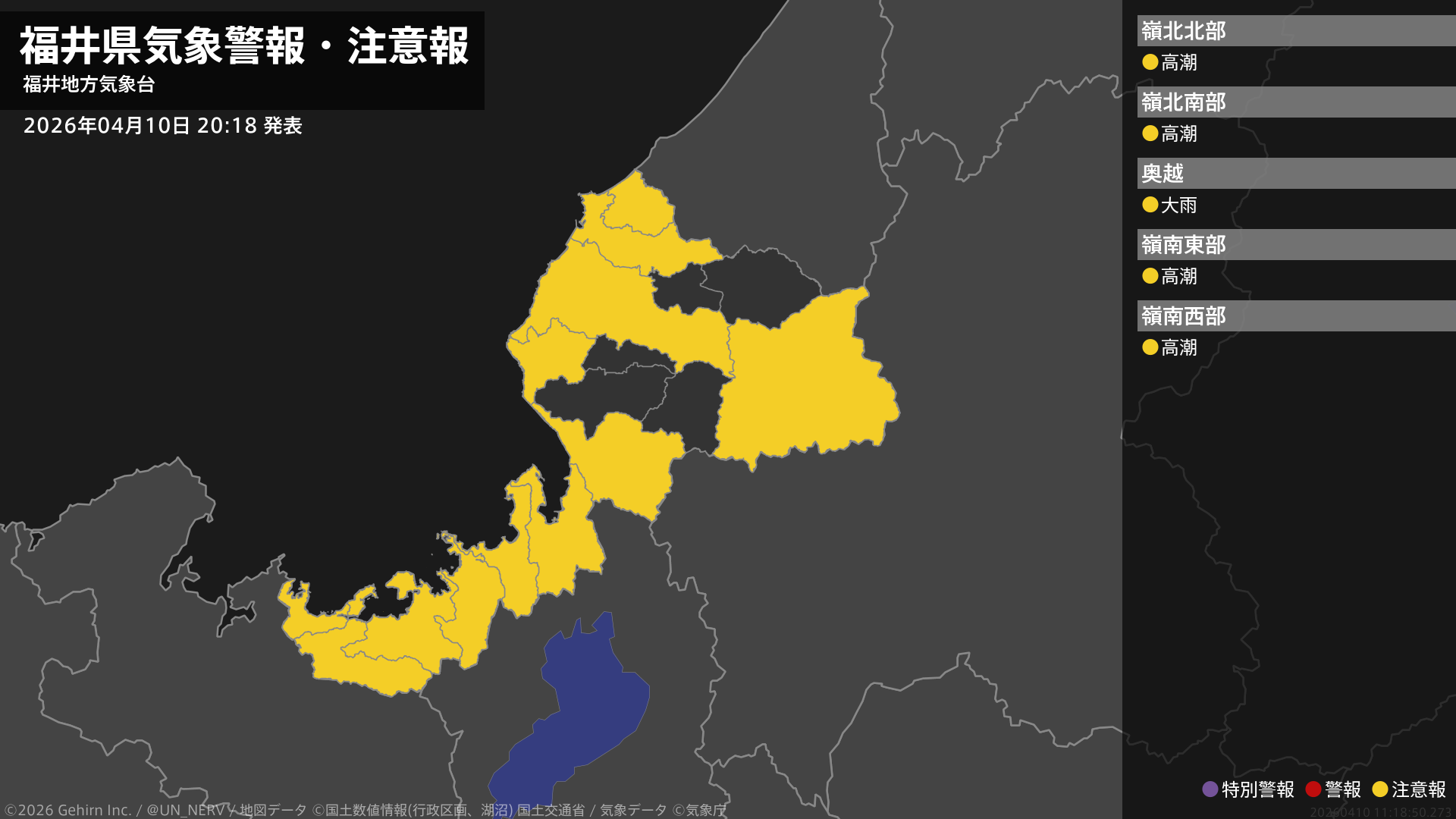 【福井県 気象警報・注意報 2026年04月10日 20:18】嶺北では、11日明け方まで土砂災害に注意してください。福井県では、10日夜遅くまで高潮に注意してください。#気象警報注意報 #福井県
