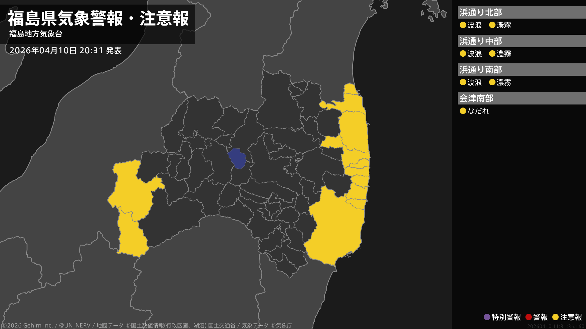 【福島県 気象警報・注意報 2026年04月10日 20:31】浜通りでは、11日昼前まで高波や濃霧による視程障害に注意してください。会津では、ここしばらくなだれに注意してください。#気象警報注意報 #福島県