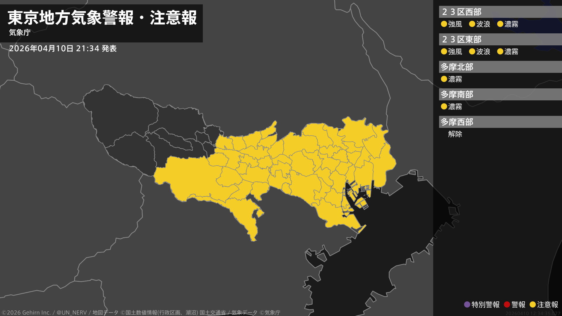 【東京都 気象警報・注意報 2026年04月10日 21:34】東京地方、伊豆諸島北部、伊豆諸島南部では強風や高波に、伊豆諸島北部、伊豆諸島南部では急な強い雨や落雷に、東京地方では濃霧による視程障害に注意してください。#気象警報注意報 #東京都