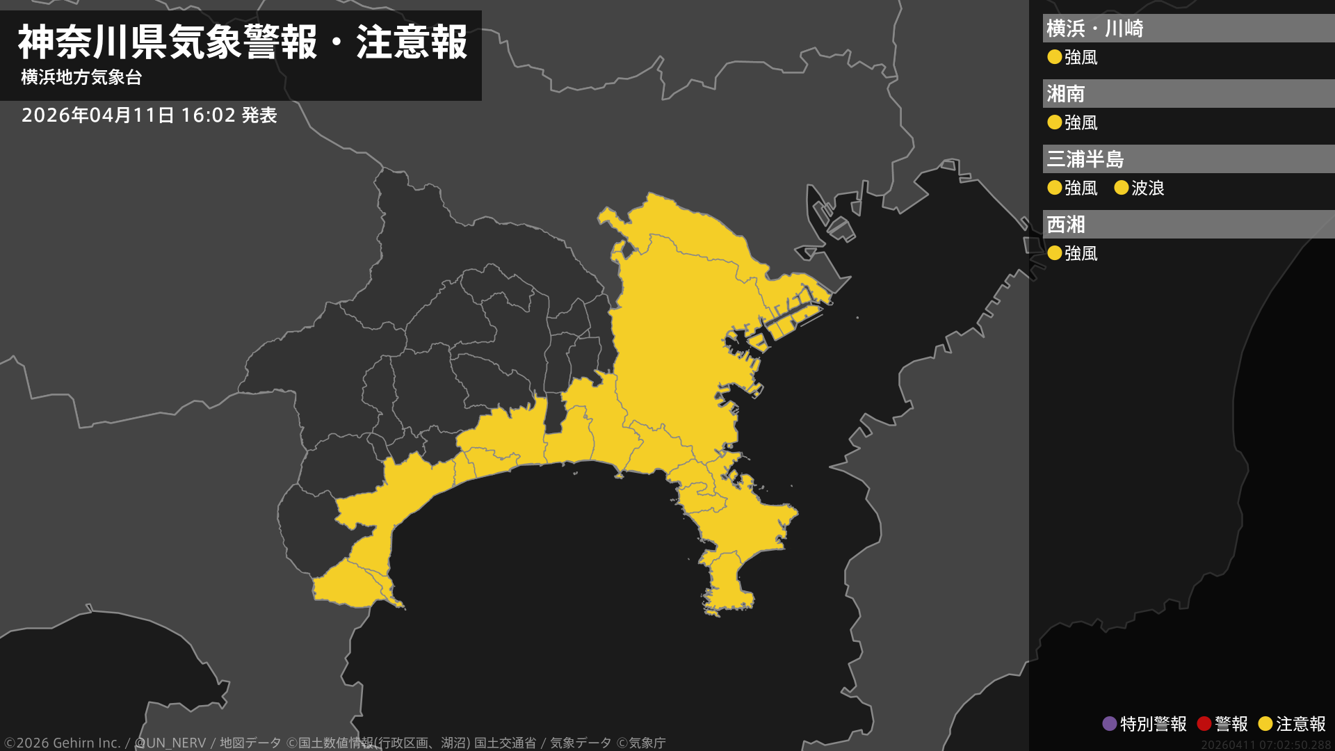 【神奈川県 気象警報・注意報 2026年04月11日 16:02】西部では11日夜遅くまで、東部では12日昼前まで、強風に注意してください。東部では、12日明け方まで高波に注意してください。#気象警報注意報 #神奈川県