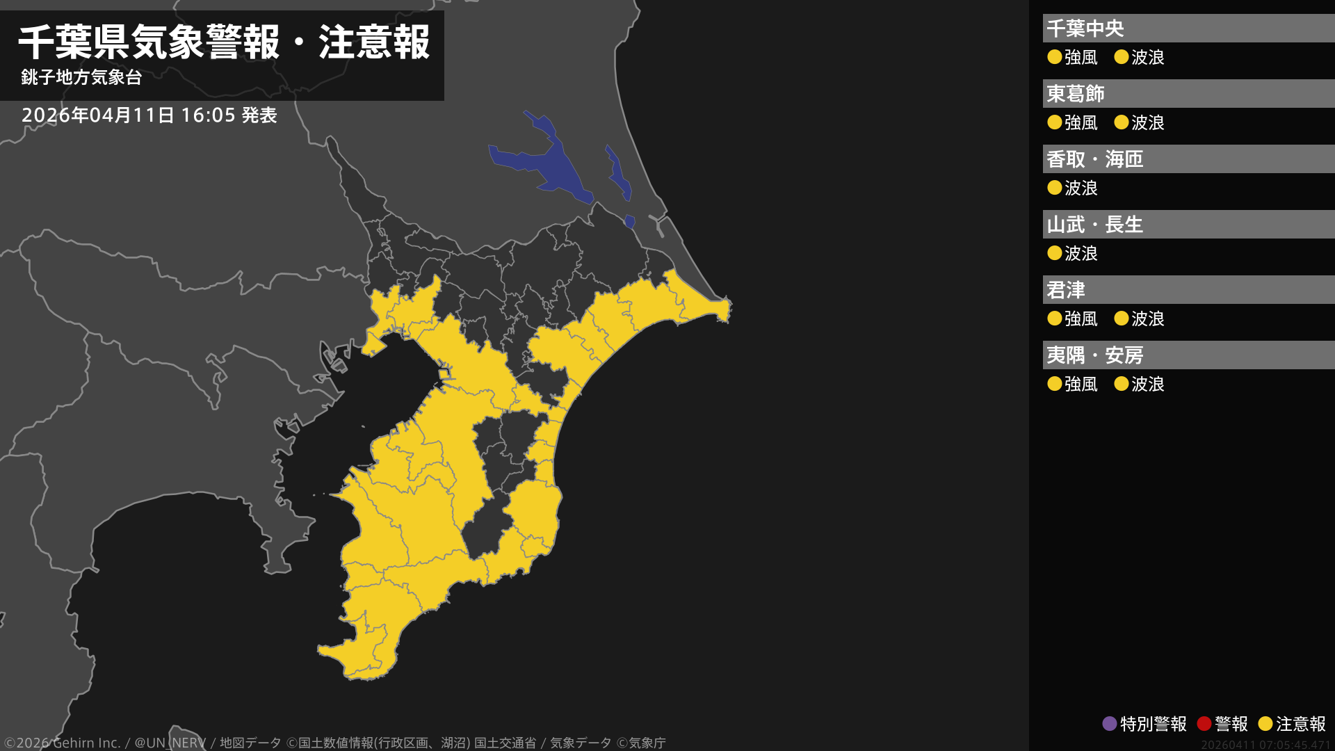 【千葉県 気象警報・注意報 2026年04月11日 16:05】北西部、南部では、強風に注意してください。千葉県では、高波に注意してください。#気象警報注意報 #千葉県