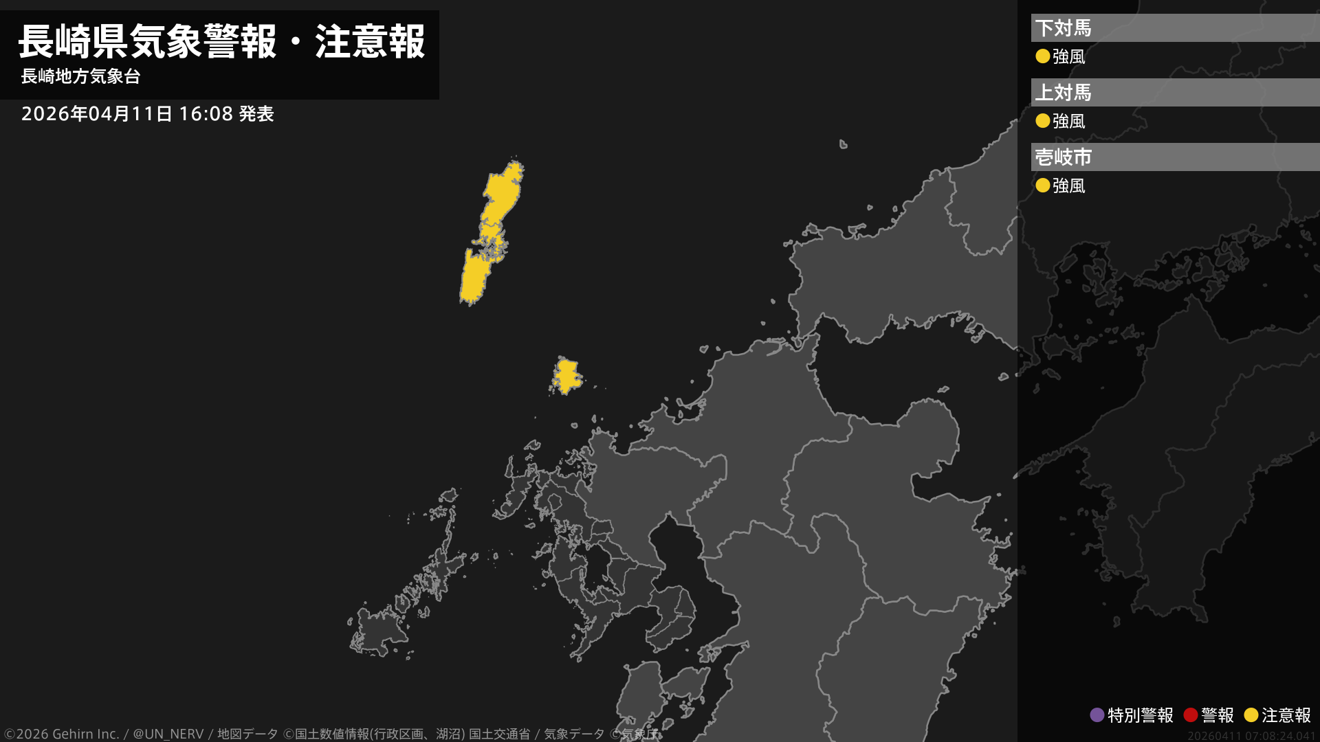 【長崎県 気象警報・注意報 2026年04月11日 16:08】壱岐・対馬では、11日夜遅くまで強風に注意してください。#気象警報注意報 #長崎県