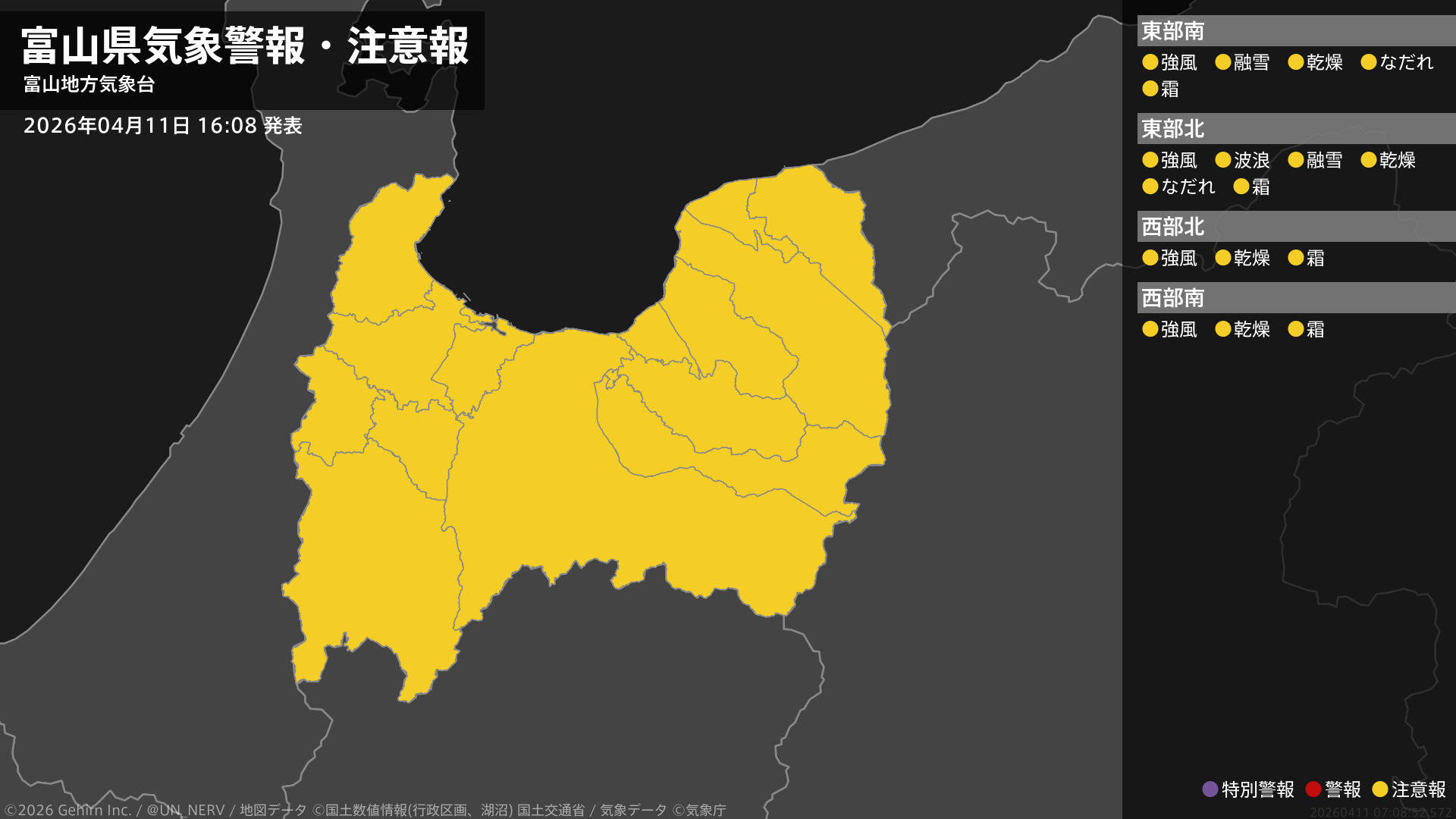 【富山県 気象警報・注意報 2026年04月11日 16:08】富山県では、強風や乾燥、霜に対する農作物の管理に注意してください。東部では、高波や融雪による土砂災害、なだれに注意してください。#気象警報注意報 #富山県
