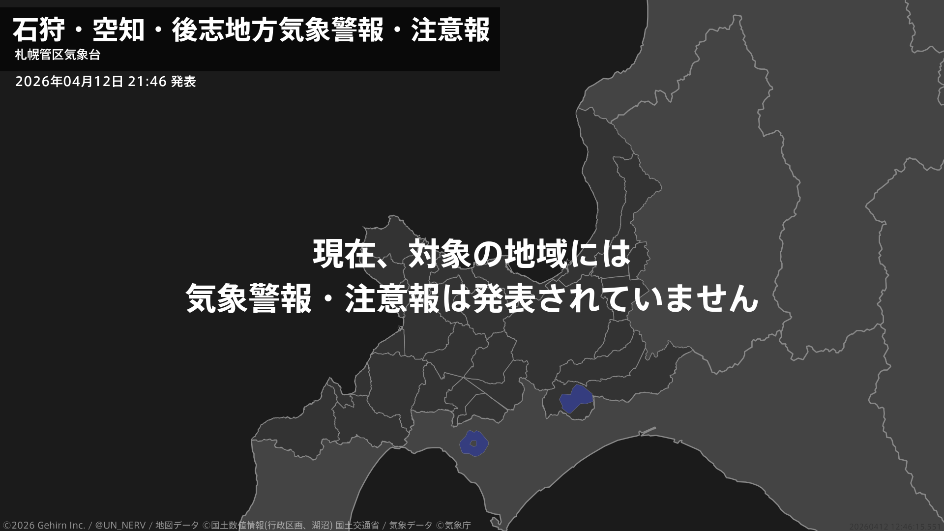 【石狩・空知・後志地方 気象警報・注意報 2026年04月12日 21:46】
