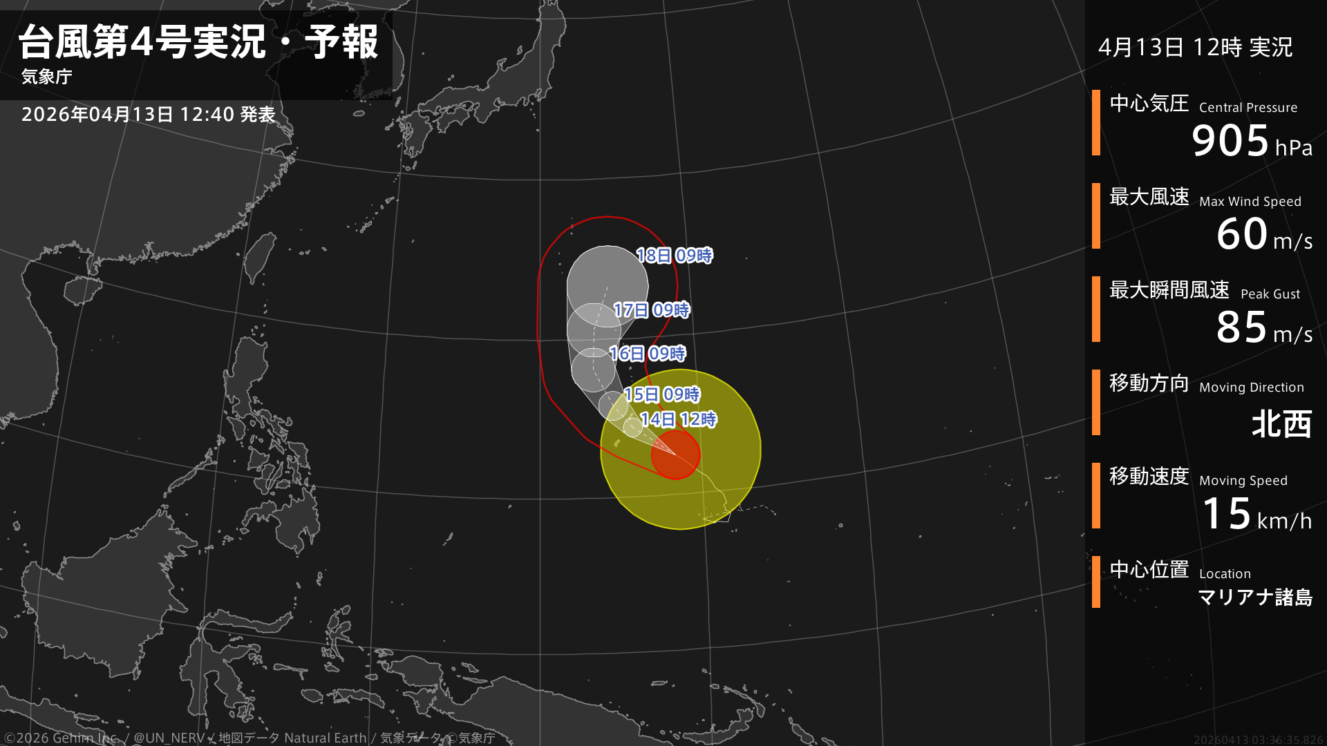 【台風第4号実況・予報 2026年04月13日 12:36】大型で猛烈な台風第4号(シンラコウ)は、マリアナ諸島を1時間に15キロの速さで北西に進んでいます。#台風情報