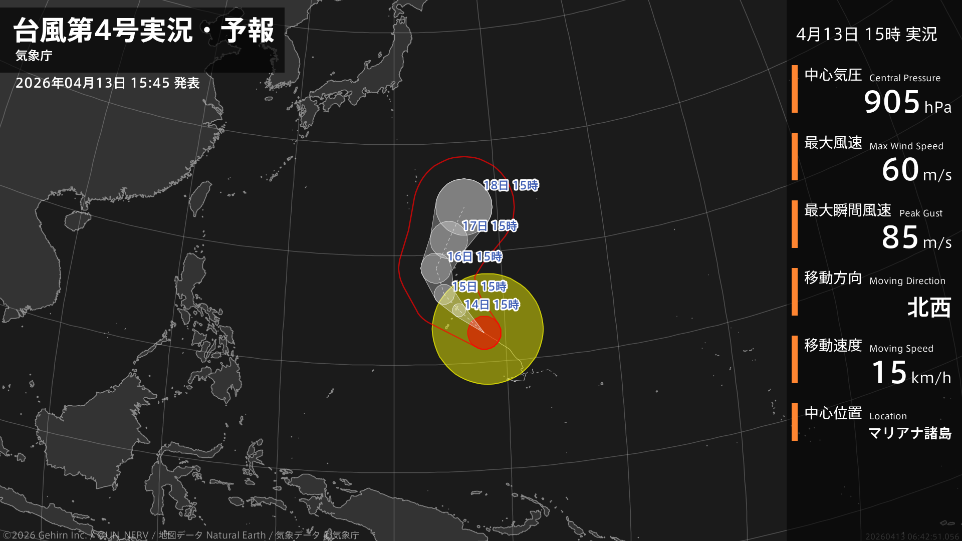 【台風第4号実況・予報 2026年04月13日 15:42】大型で猛烈な台風第4号(シンラコウ)は、マリアナ諸島を1時間に15キロの速さで北西に進んでいます。#台風情報