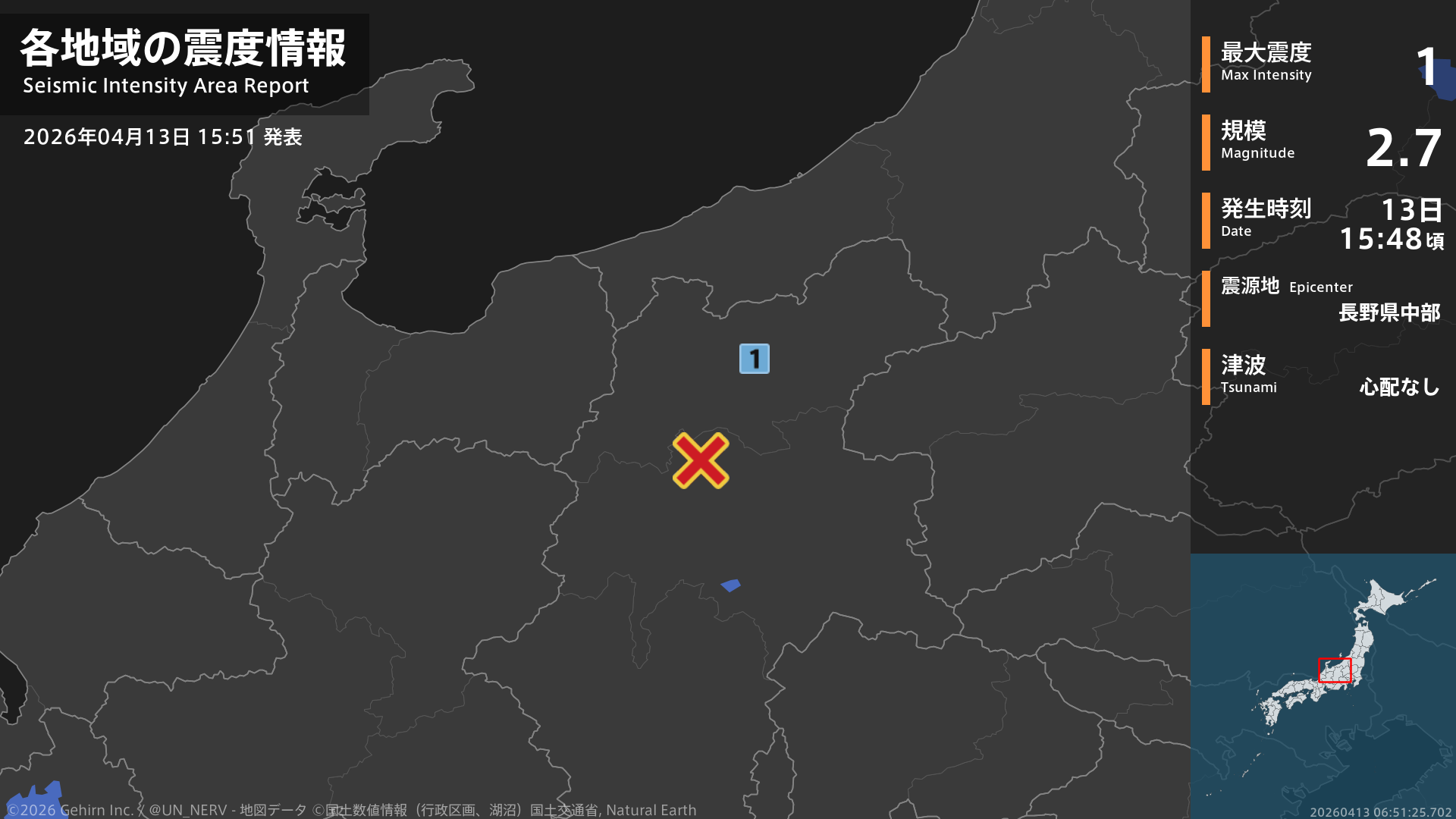 【地震情報 2026年4月13日】15時48分頃、長野県中部を震源とする地震がありました。震源の深さは約10km、地震の規模はM2.7、最大震度1を長野県で観測しています。この地震による津波の心配はありません。#地震 #長野県
