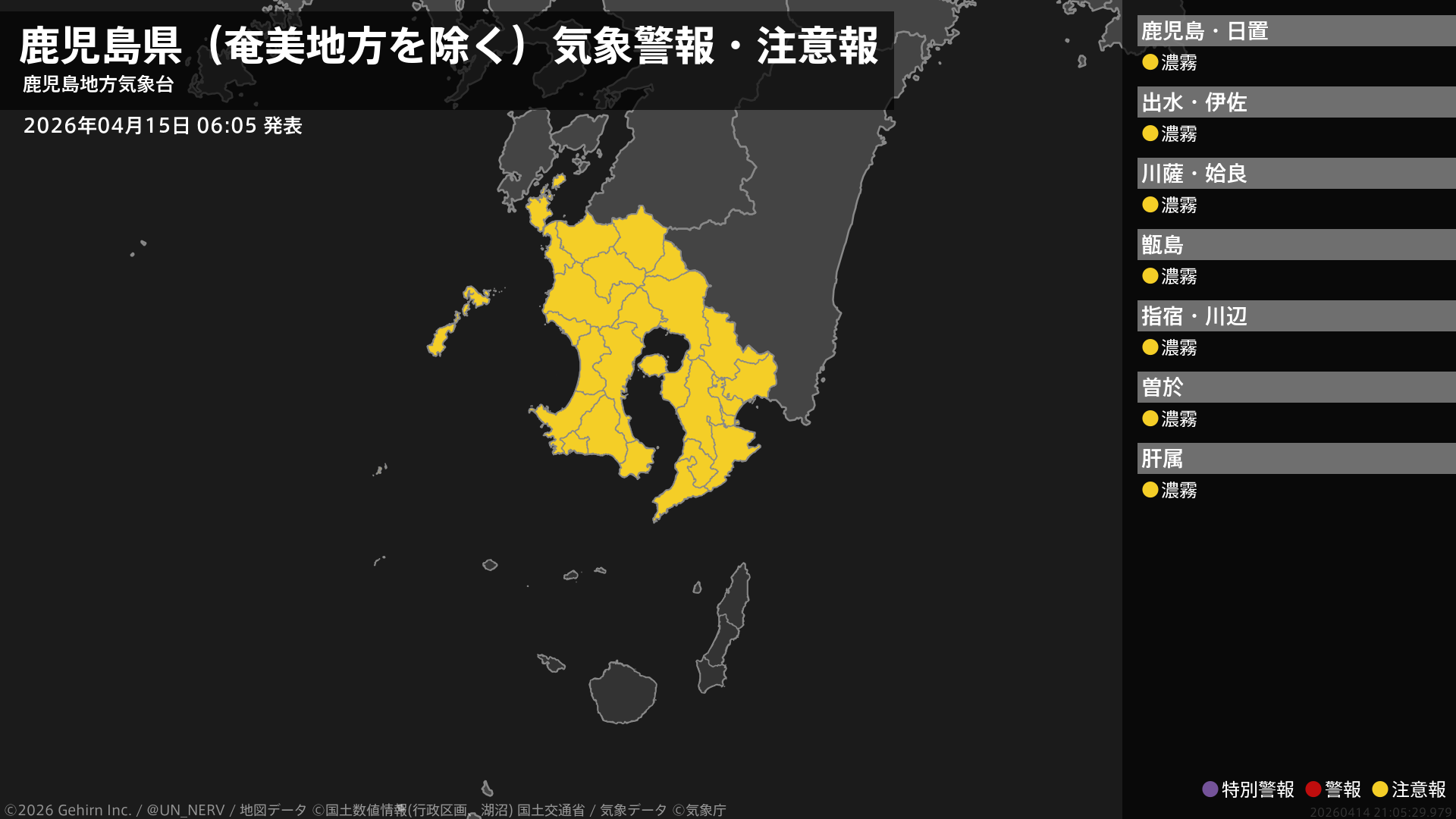 【鹿児島県(奄美地方を除く) 気象警報・注意報 2026年04月15日 06:05】薩摩、大隅地方では、15日昼前まで濃霧による視程障害に注意してください。#気象警報注意報 #鹿児島県(奄美地方除く)