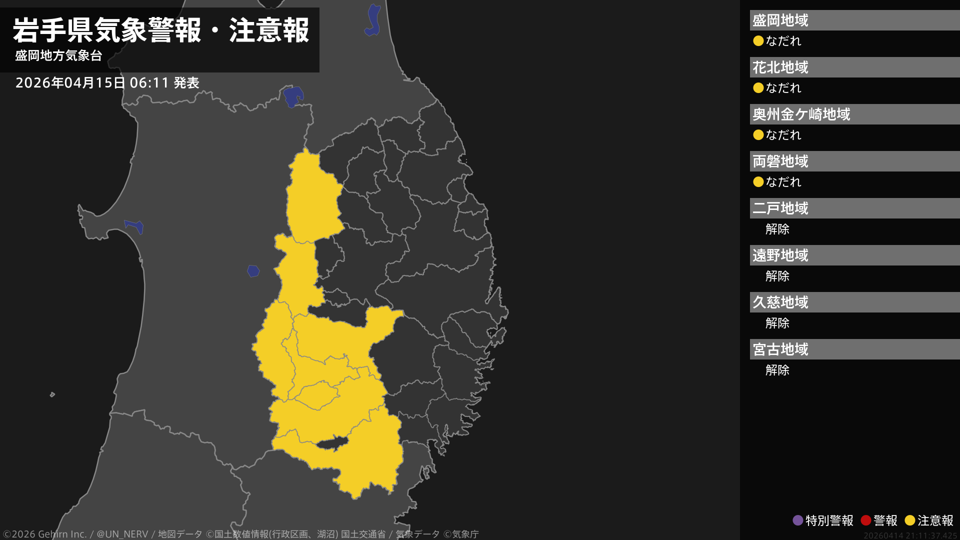 【岩手県 気象警報・注意報 2026年04月15日 06:11】内陸では、ここしばらくなだれに注意してください。#気象警報注意報 #岩手県