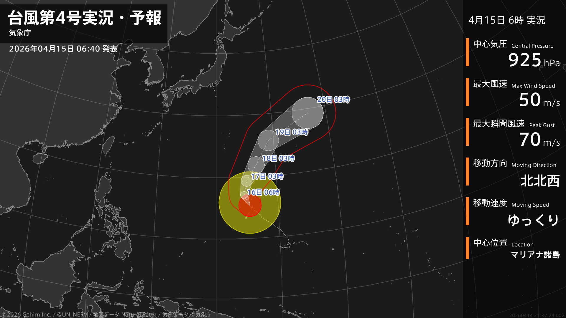 【台風第4号実況・予報 2026年04月15日 06:37】大型で非常に強い台風第4号(シンラコウ)は、マリアナ諸島をゆっくりと北北西に進んでいます。#台風情報