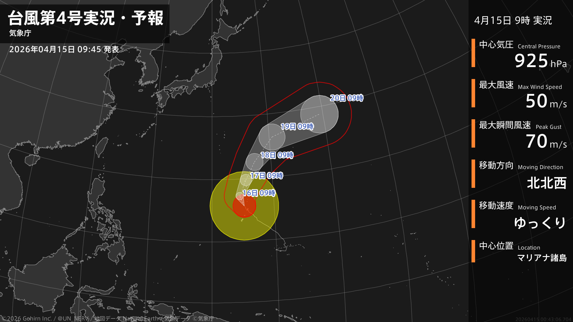 【台風第4号実況・予報 2026年04月15日 09:43】大型で非常に強い台風第4号(シンラコウ)は、マリアナ諸島をゆっくりと北北西に進んでいます。#台風情報
