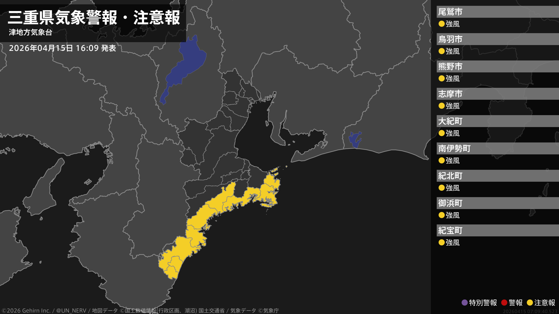 【三重県 気象警報・注意報 2026年04月15日 16:09】南部では、16日明け方から16日昼前まで強風に注意してください。#気象警報注意報 #三重県