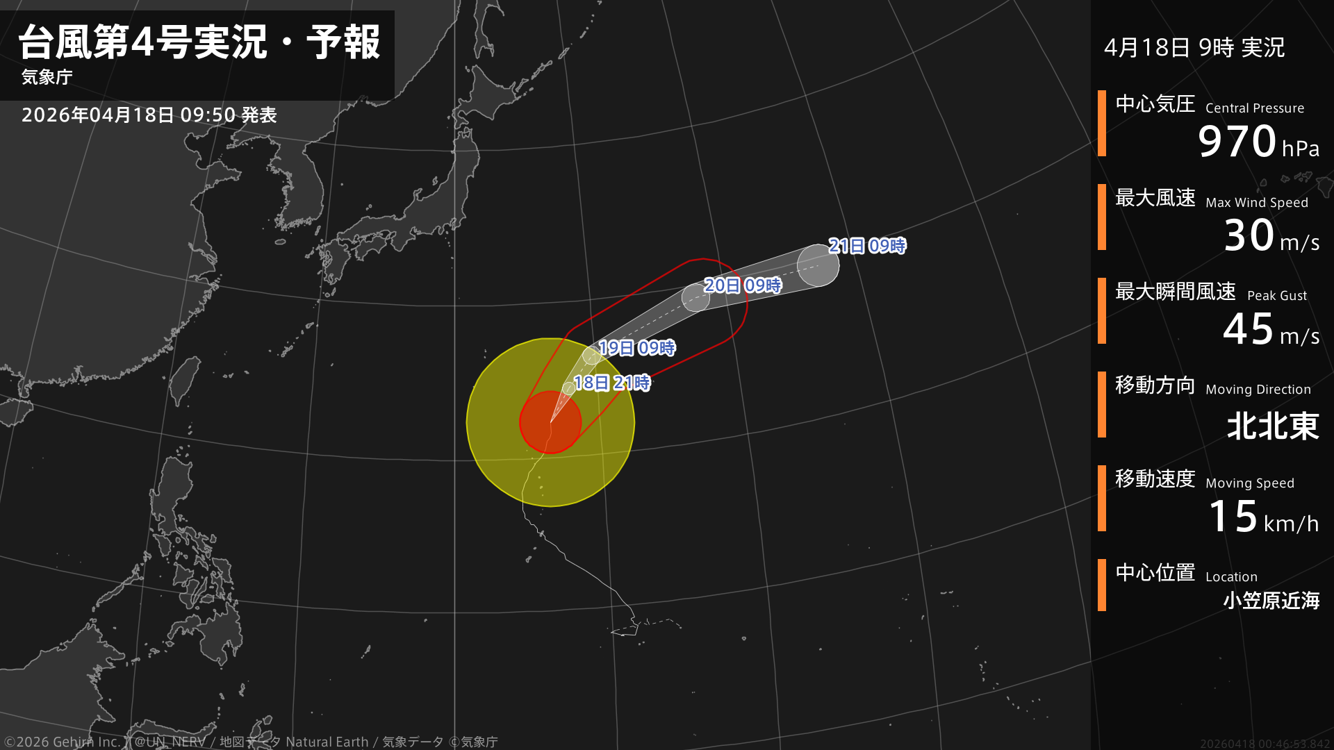 【台風第4号実況・予報 2026年04月18日 09:46】大型の台風第4号(シンラコウ)は、小笠原近海を1時間に15キロの速さで北北東に進んでいます。#台風情報
