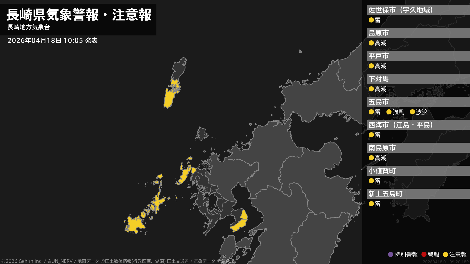 【長崎県 気象警報・注意報 2026年04月18日 10:05】五島では、強風や高波、急な強い雨、落雷に注意してください。南部、北部、壱岐・対馬では、高潮に注意してください。#気象警報注意報 #長崎県