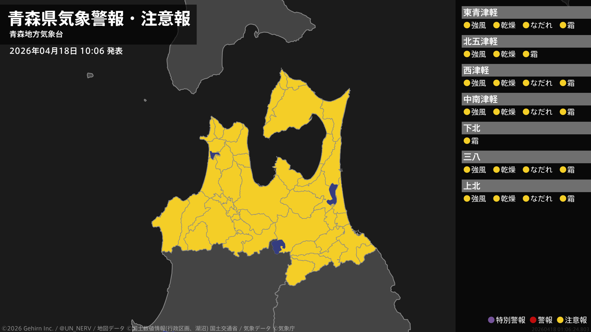 【青森県 気象警報・注意報 2026年04月18日 10:06】津軽、三八上北では、強風や乾燥、なだれに注意してください。青森県では、霜に対する農作物の管理に注意してください。#気象警報注意報 #青森県