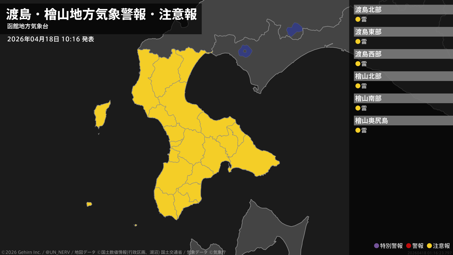 【渡島・檜山地方 気象警報・注意報 2026年04月18日 10:16】渡島、檜山地方では、18日夕方まで急な強い雨や落雷に注意してください。#気象警報注意報 #渡島地方 #檜山地方