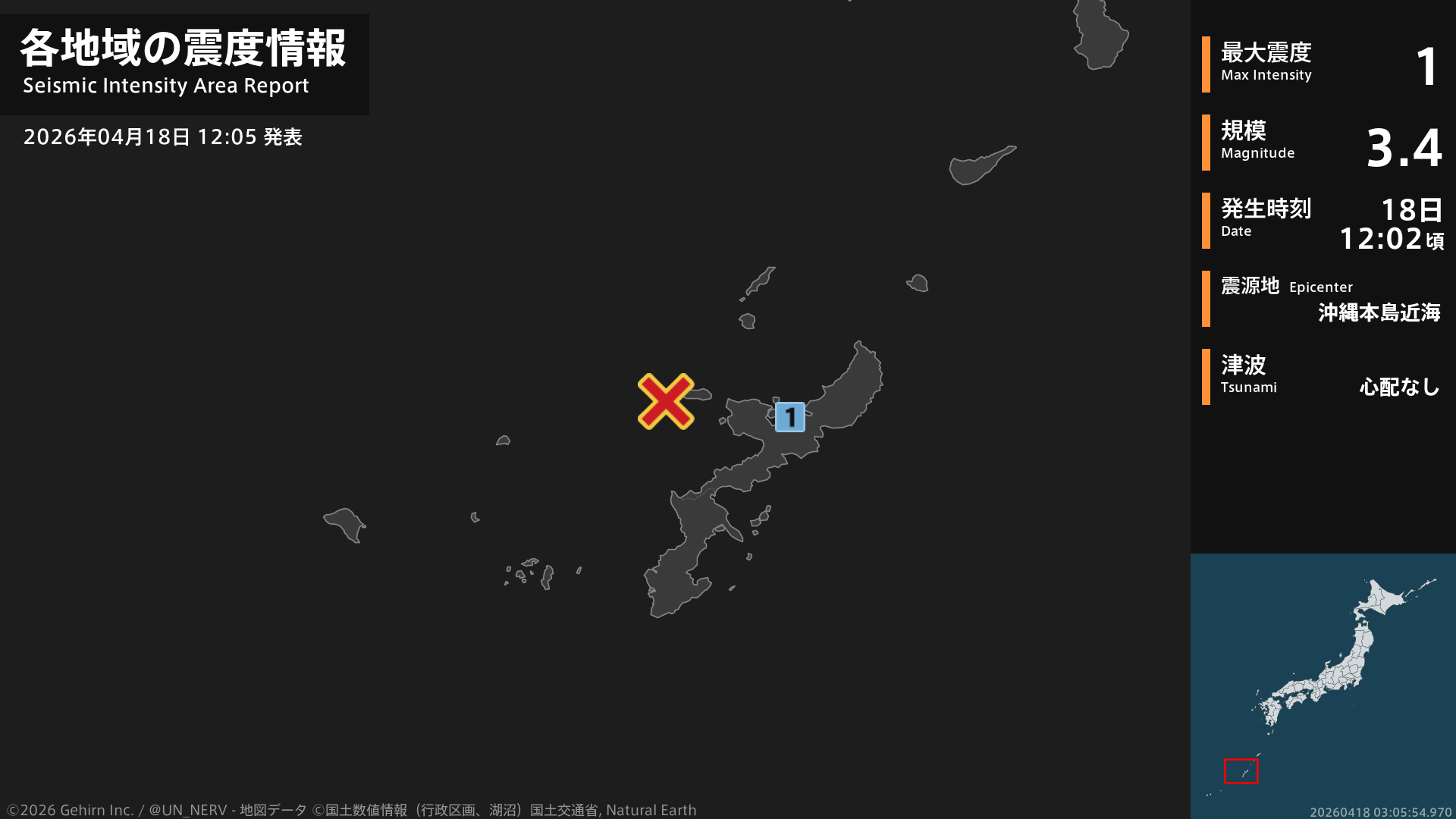 【地震情報 2026年4月18日】12時2分頃、沖縄本島近海を震源とする地震がありました。震源の深さは約40km、地震の規模はM3.4、最大震度1を沖縄県で観測しています。この地震による津波の心配はありません。#地震 #沖縄県