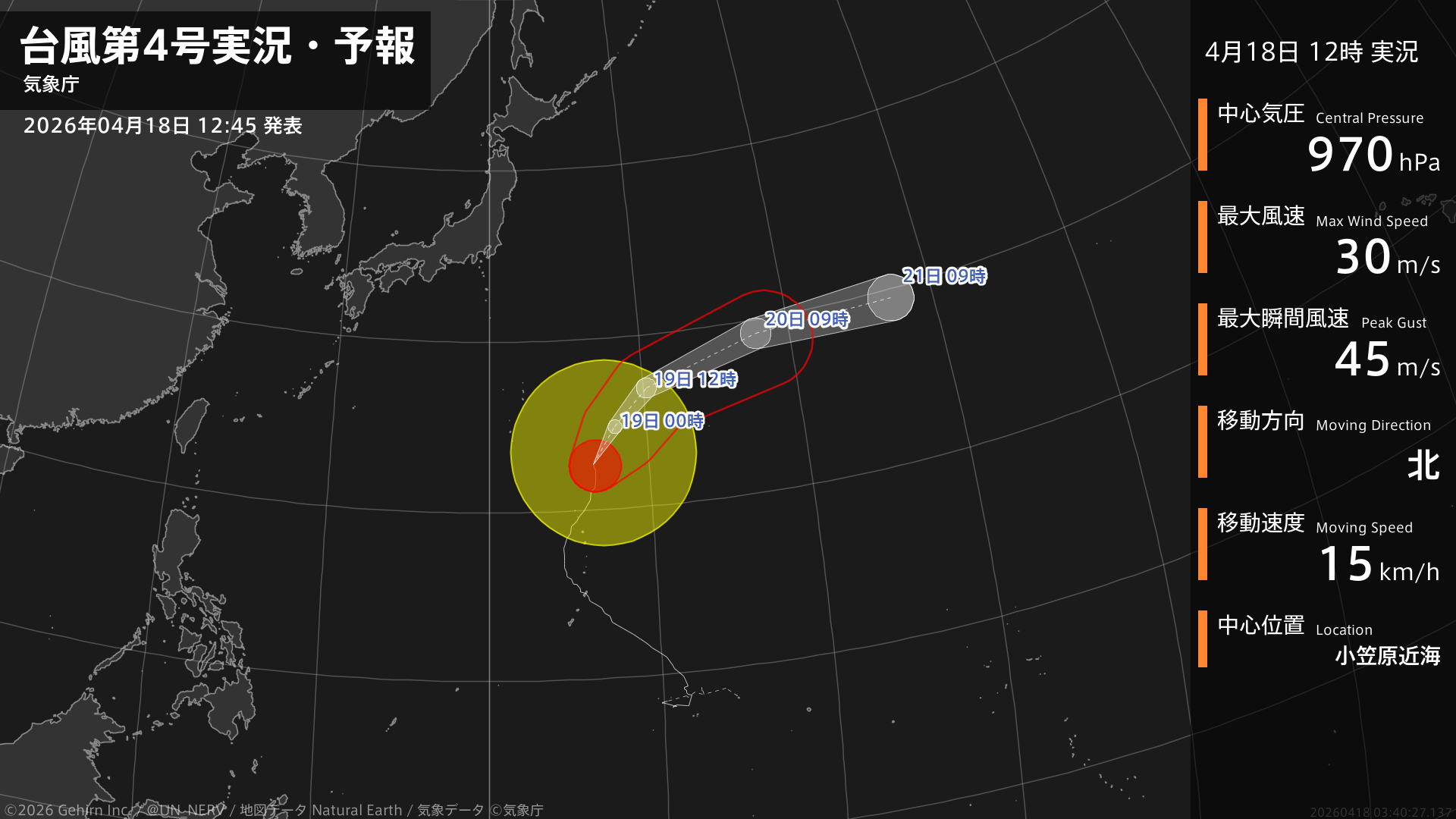 【台風第4号実況・予報 2026年04月18日 12:40】大型の台風第4号(シンラコウ)は、小笠原近海を1時間に15キロの速さで北に進んでいます。#台風情報