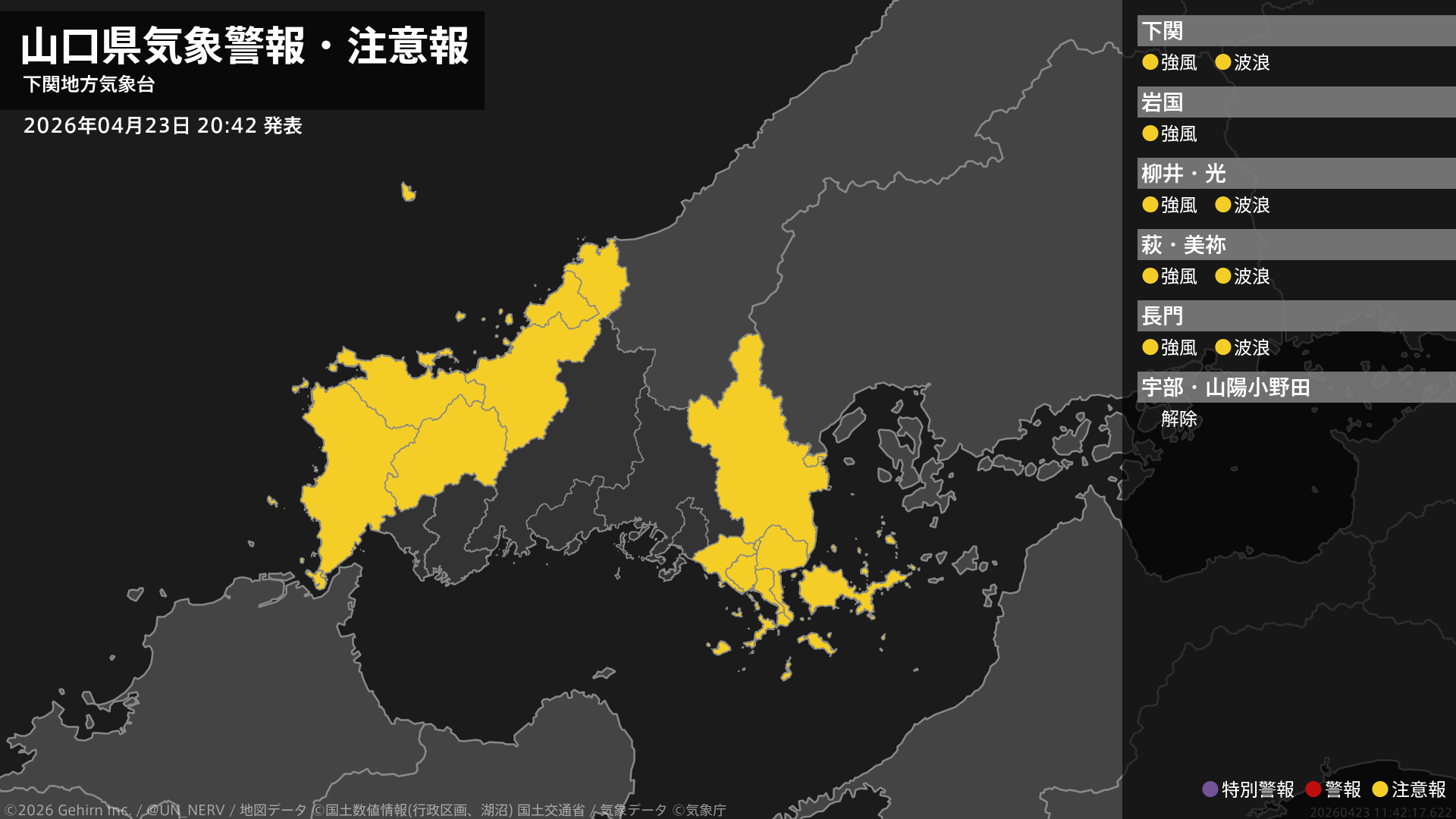 【山口県 気象警報・注意報 2026年04月23日 20:42】