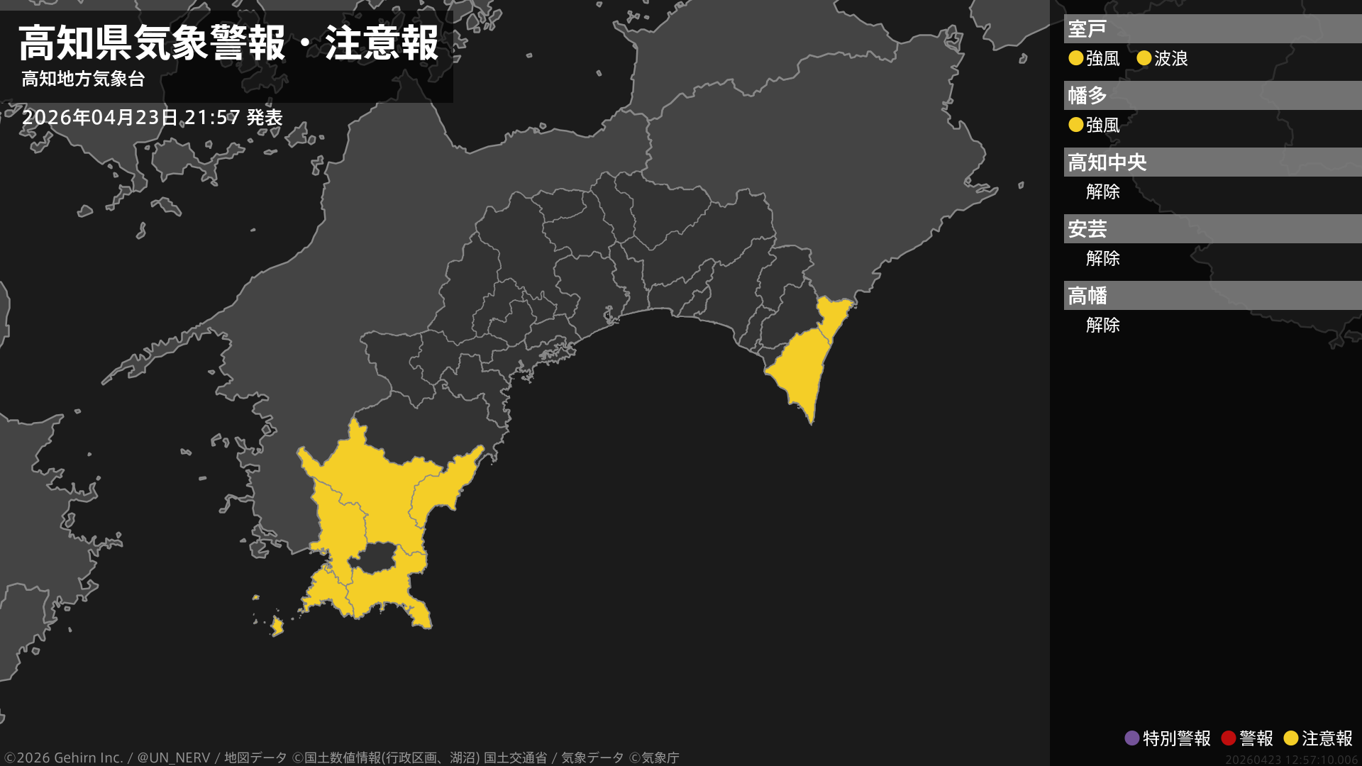 【高知県 気象警報・注意報 2026年04月23日 21:57】