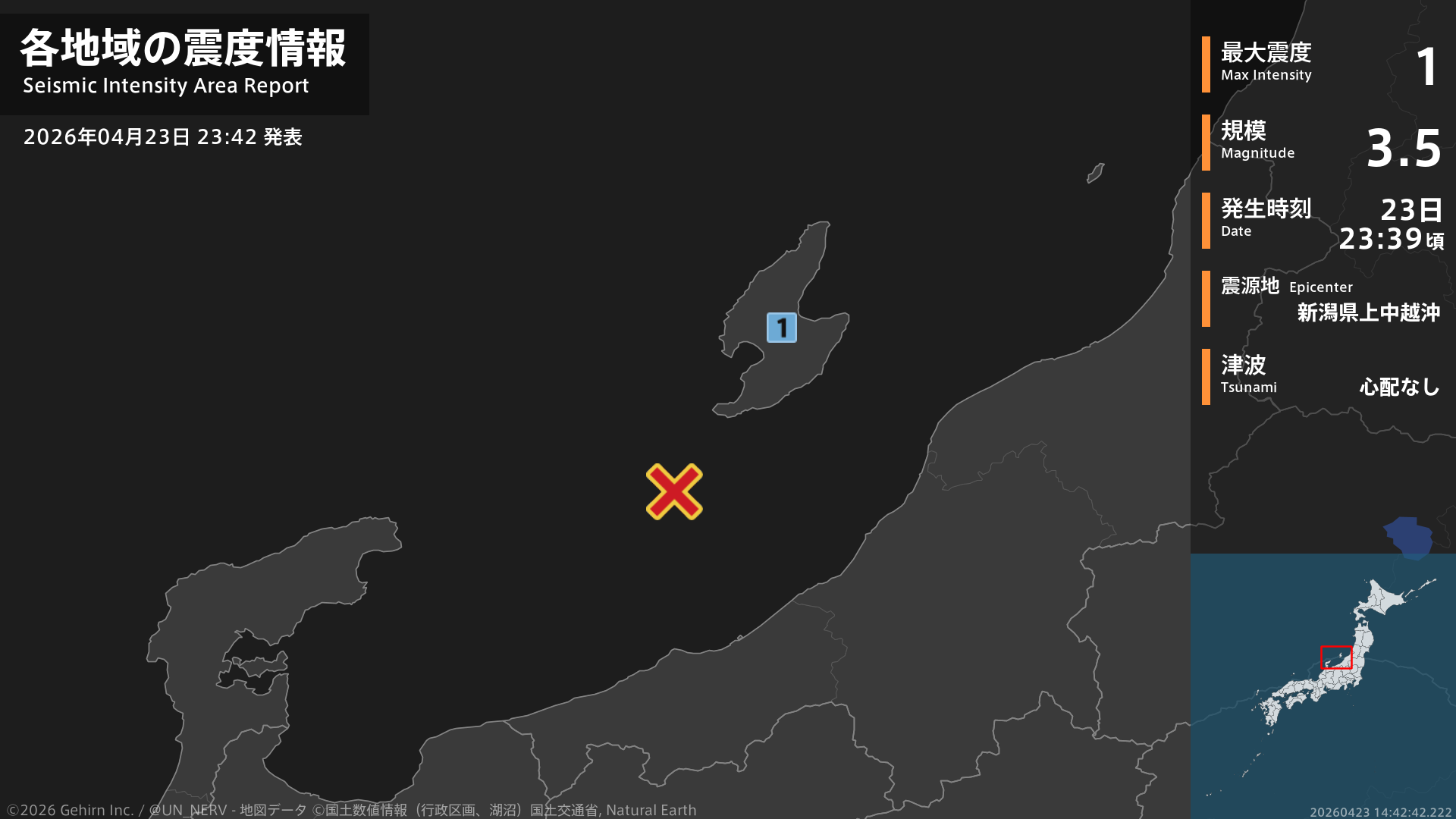 23時39分頃、新潟県上中越沖を震源とする地震がありました。震源の深さは約10km、地震の規模はM3.5、最大震度1を新潟県で観測しています。この地震による津波の心配はありません。