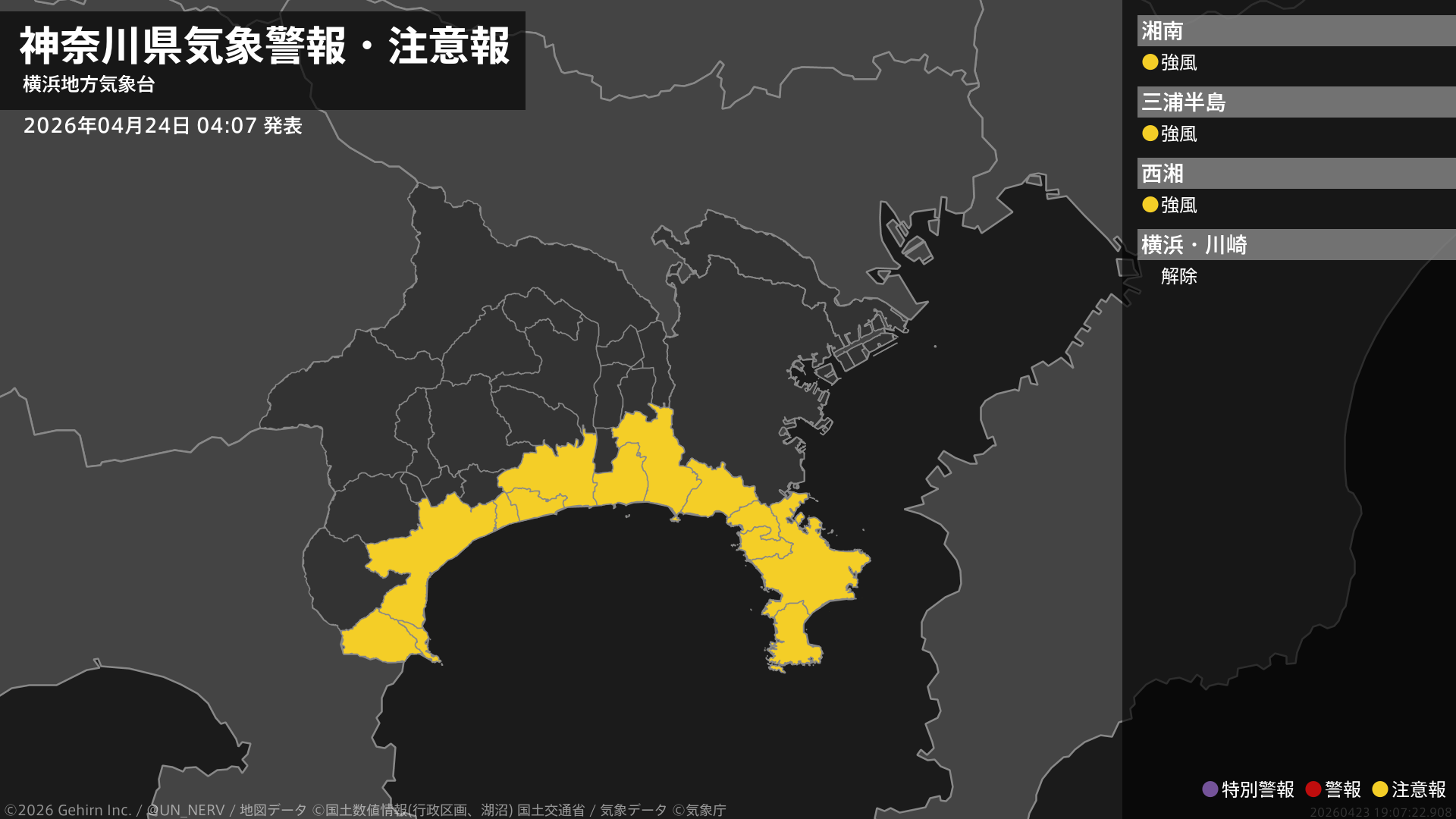 【神奈川県 気象警報・注意報 2026年04月24日 04:07】神奈川県では、24日朝まで強風に注意してください。#気象警報注意報 #神奈川県