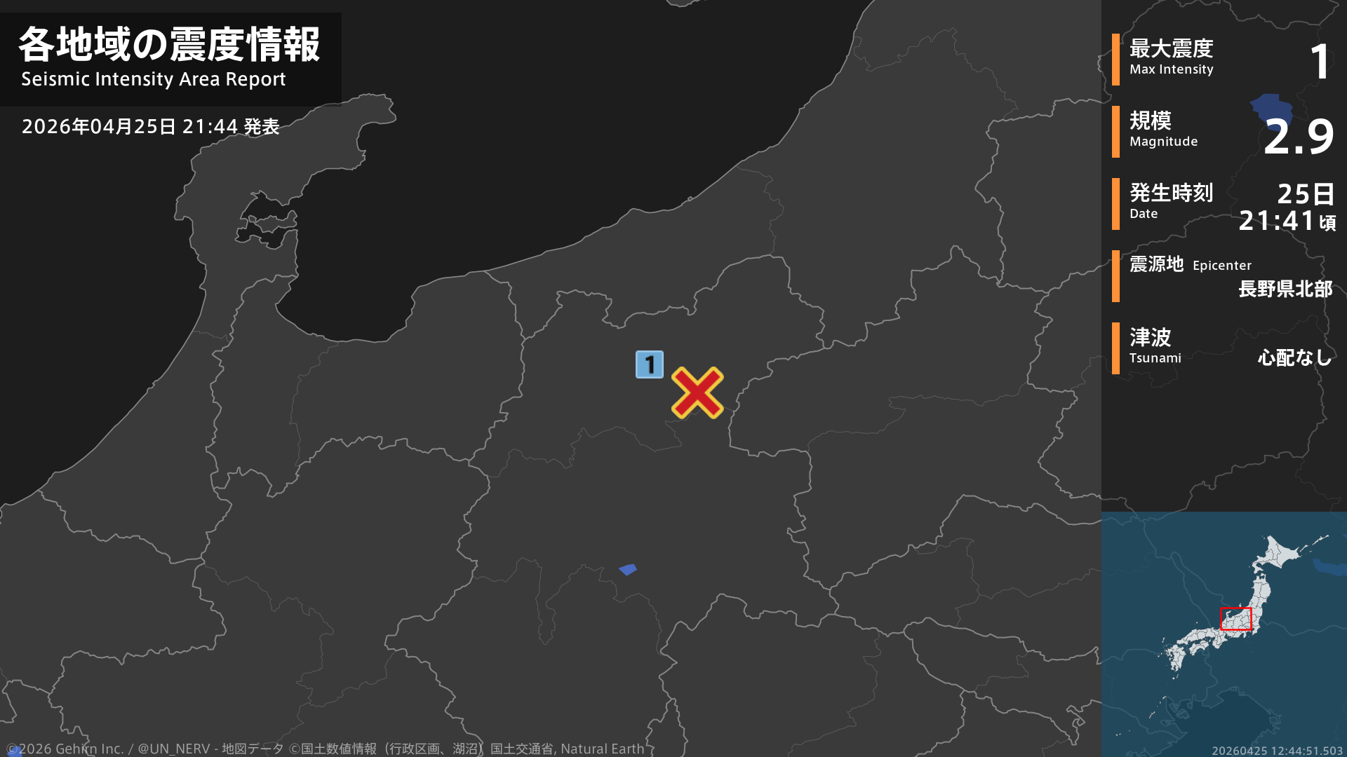 【地震情報 2026年4月25日】21時41分頃、長野県北部を震源とする地震がありました。震源の深さはごく浅い、地震の規模はM2.9、最大震度1を長野県で観測しています。この地震による津波の心配はありません。#地震 #長野県