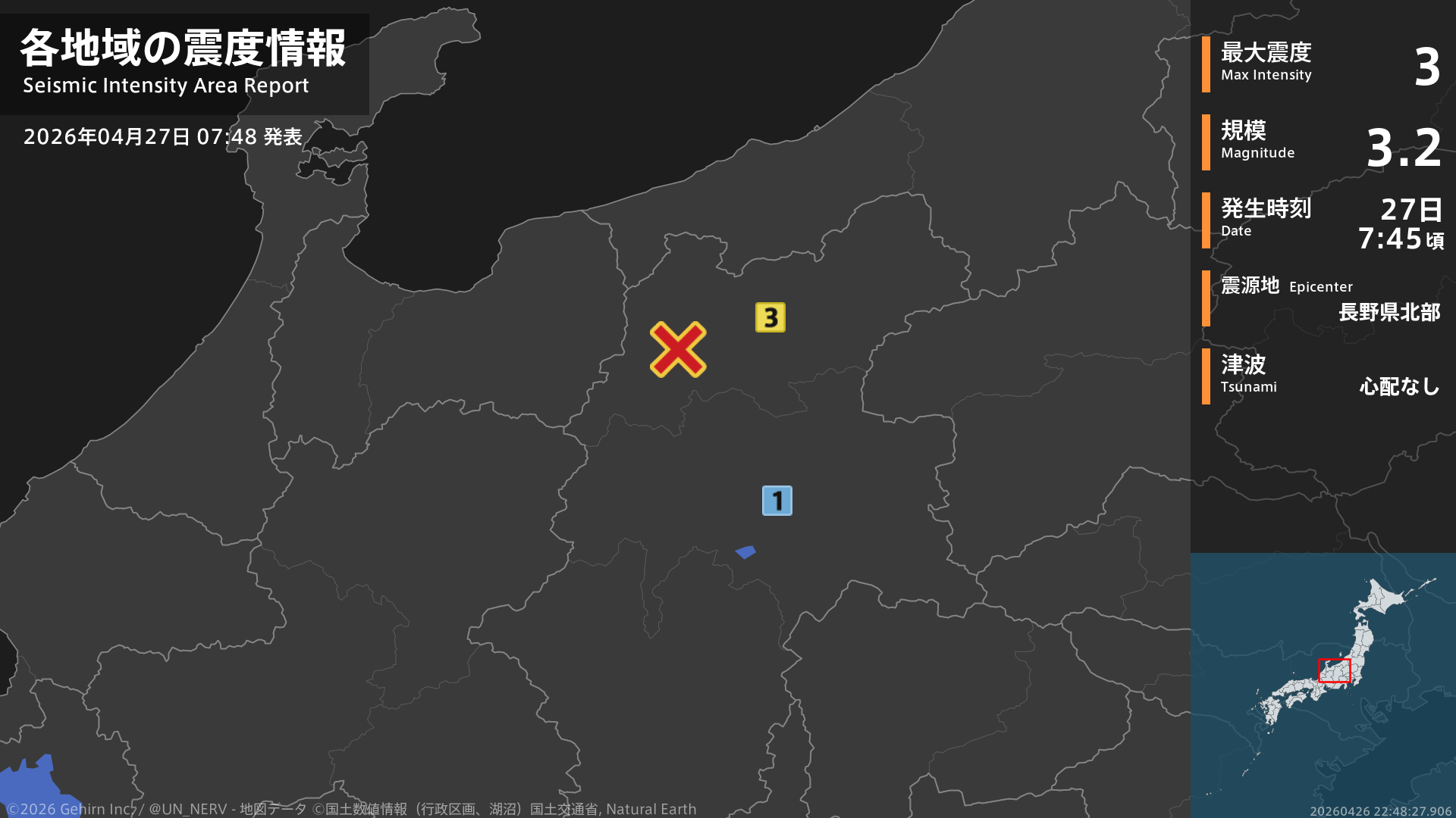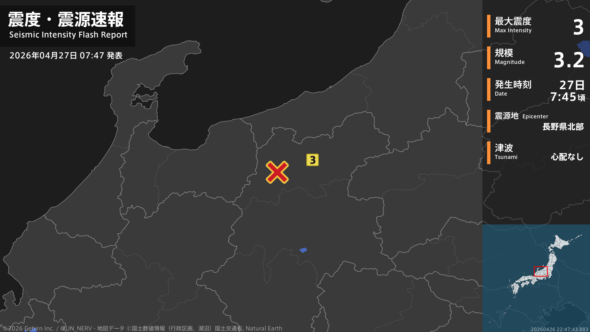 7時45分頃、長野県北部を震源とする地震がありました。震源の深さは約10km、地震の規模はM3.2、最大震度3を長野県で観測しています。この地震による津波の心配はありません。