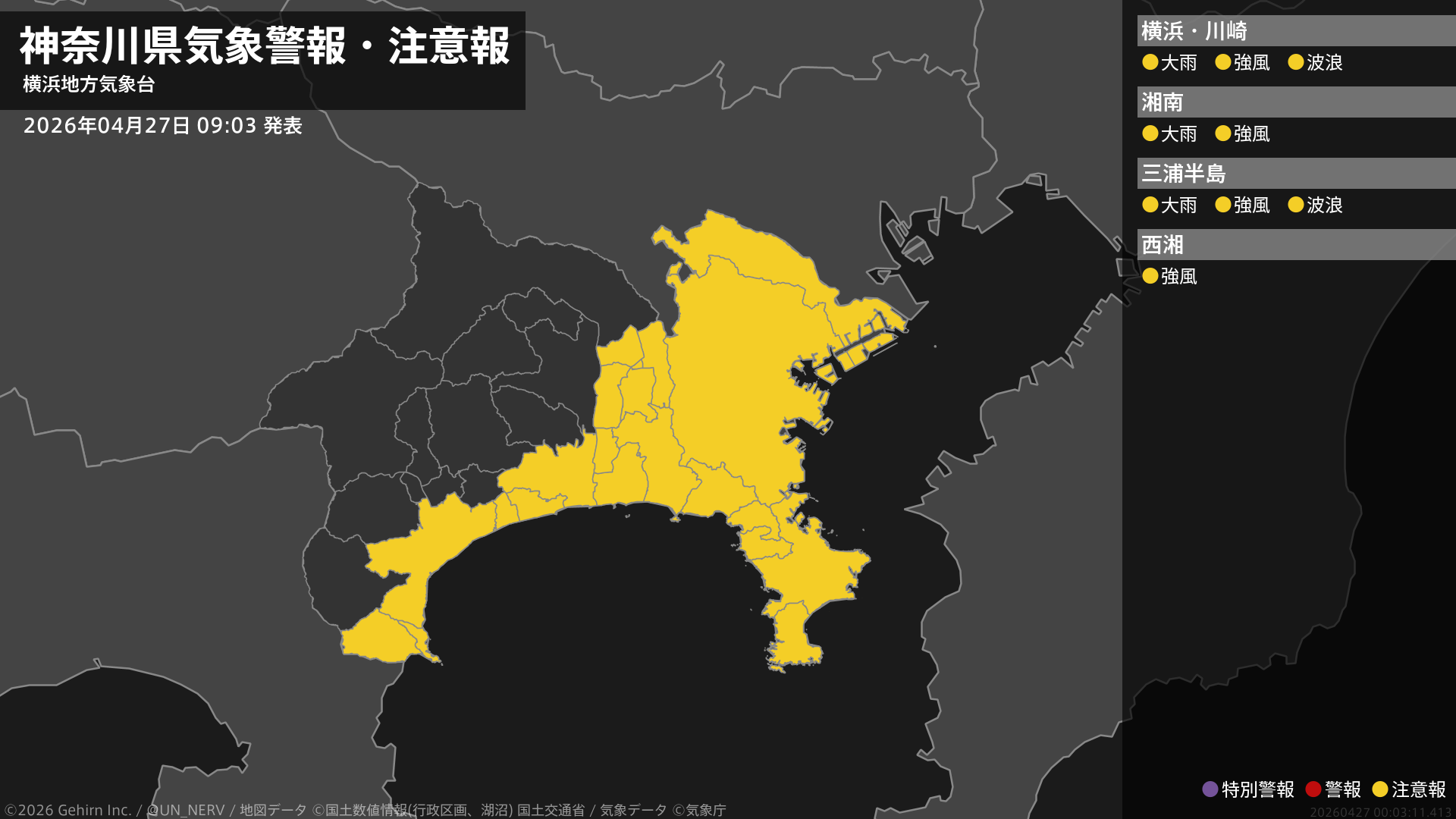 【神奈川県 気象警報・注意報 2026年04月27日 09:03】