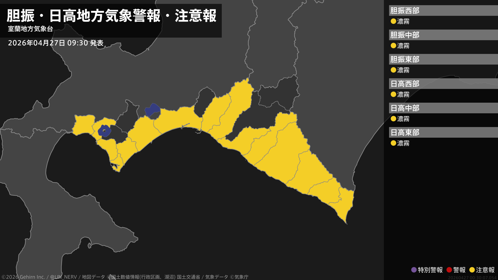 【胆振・日高地方 気象警報・注意報 2026年04月27日 09:30】