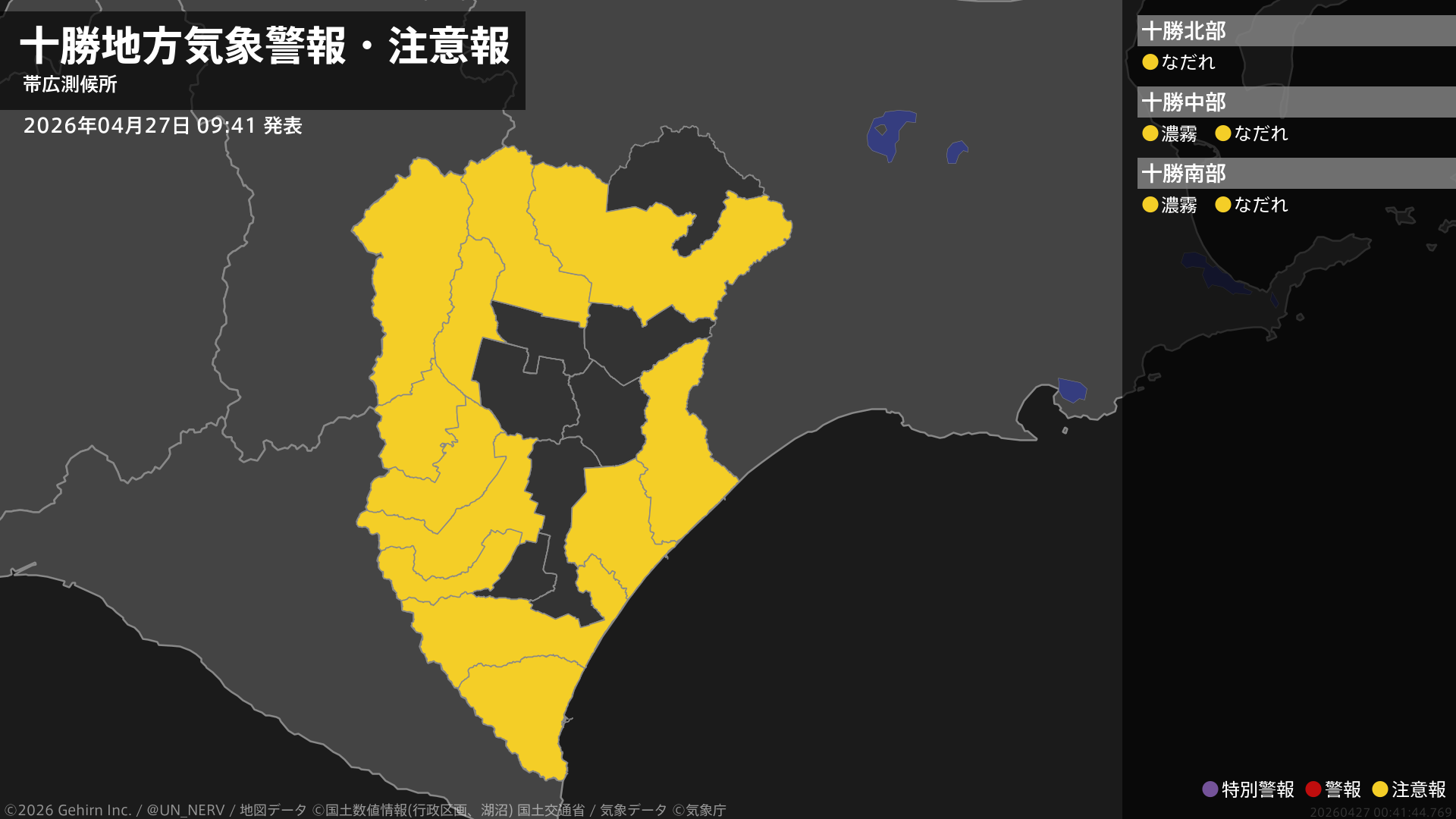 【十勝地方 気象警報・注意報 2026年04月27日 09:41】