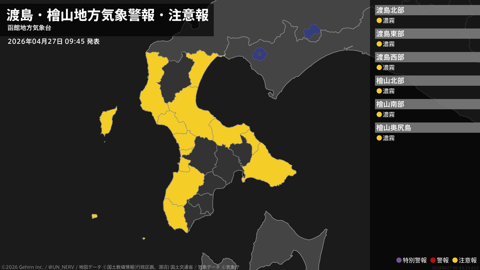 【渡島・檜山地方 気象警報・注意報 2026年04月27日 09:45】