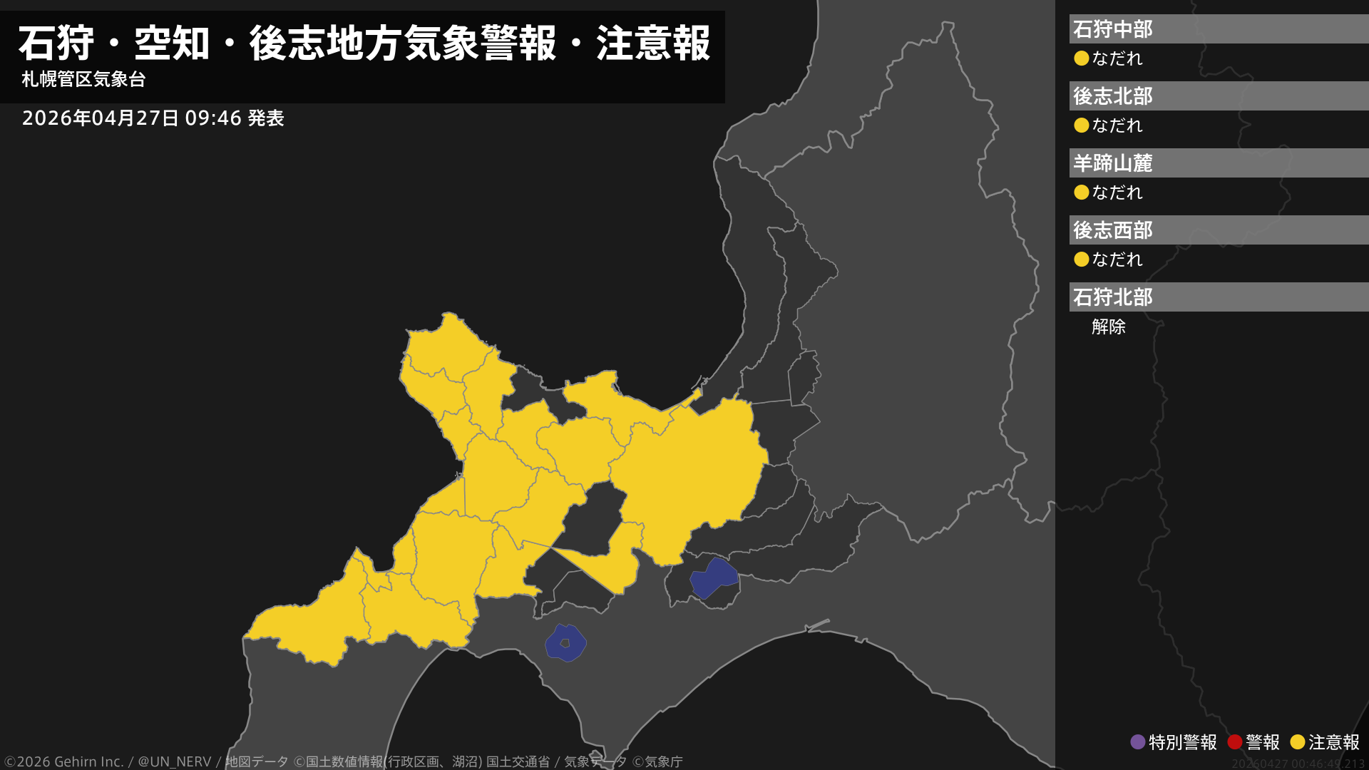 【石狩・空知・後志地方 気象警報・注意報 2026年04月27日 09:46】