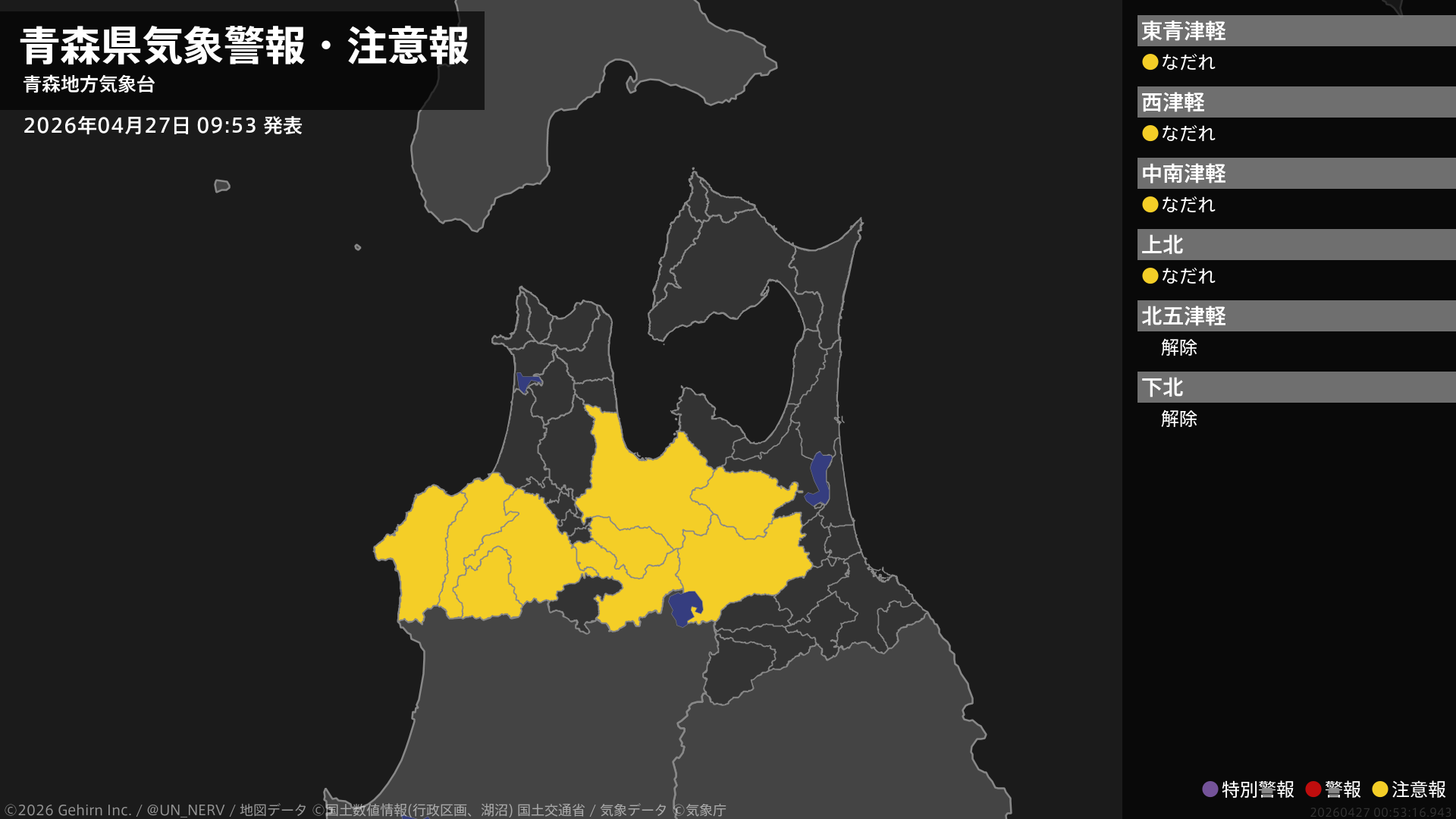 【青森県 気象警報・注意報 2026年04月27日 09:53】
