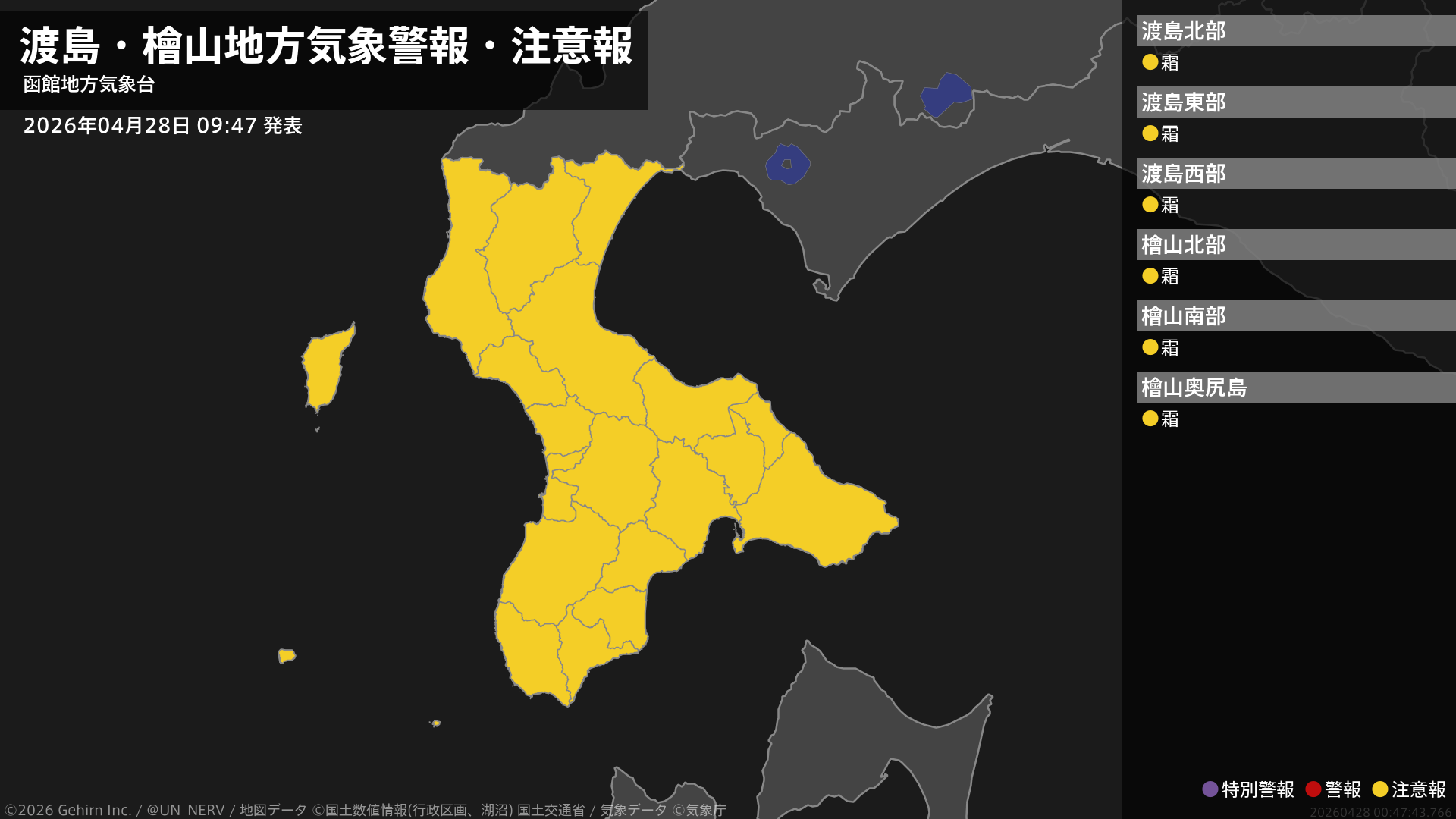 【渡島・檜山地方 気象警報・注意報 2026年04月28日 09:47】