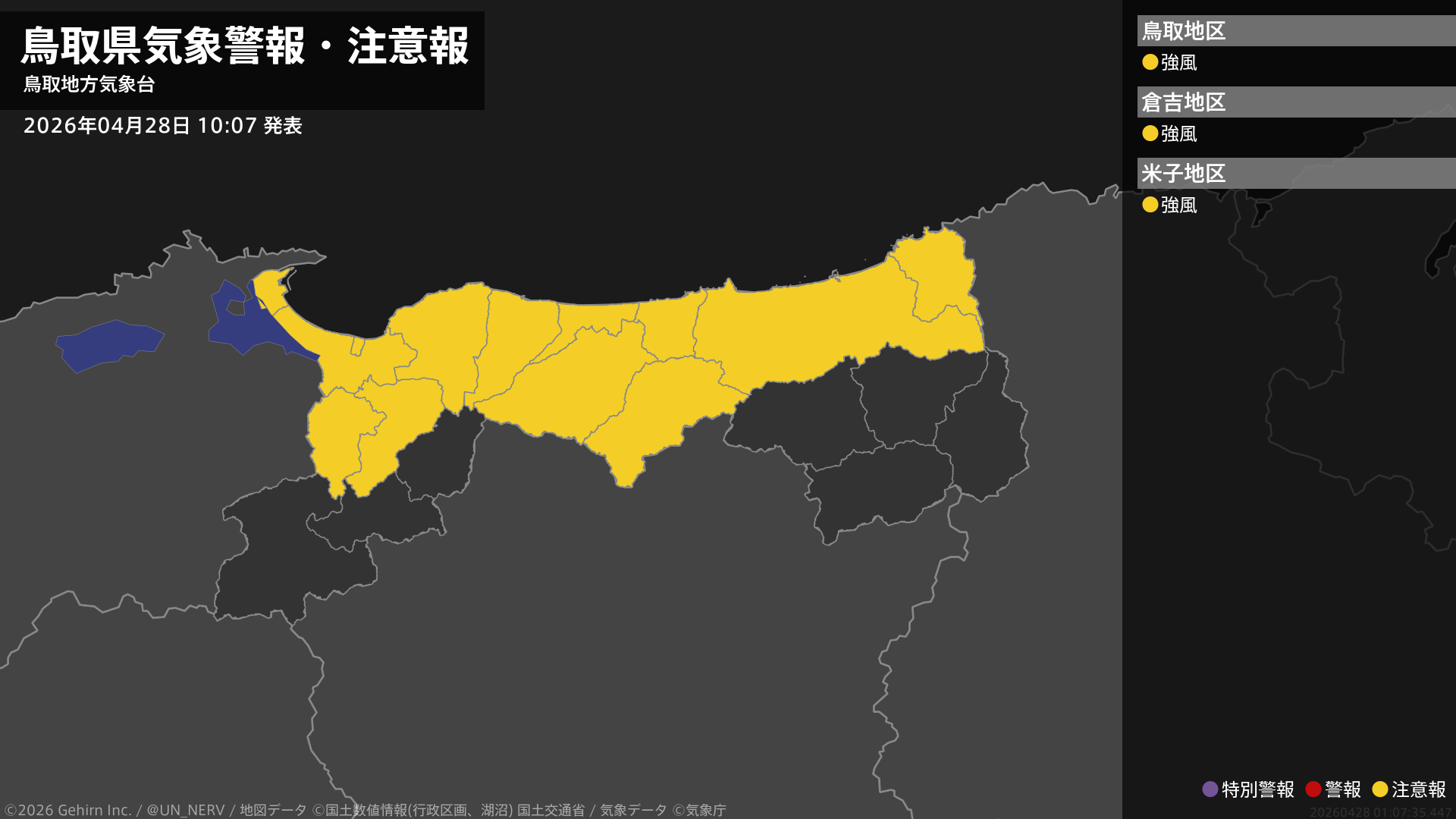 【鳥取県 気象警報・注意報 2026年04月28日 10:07】