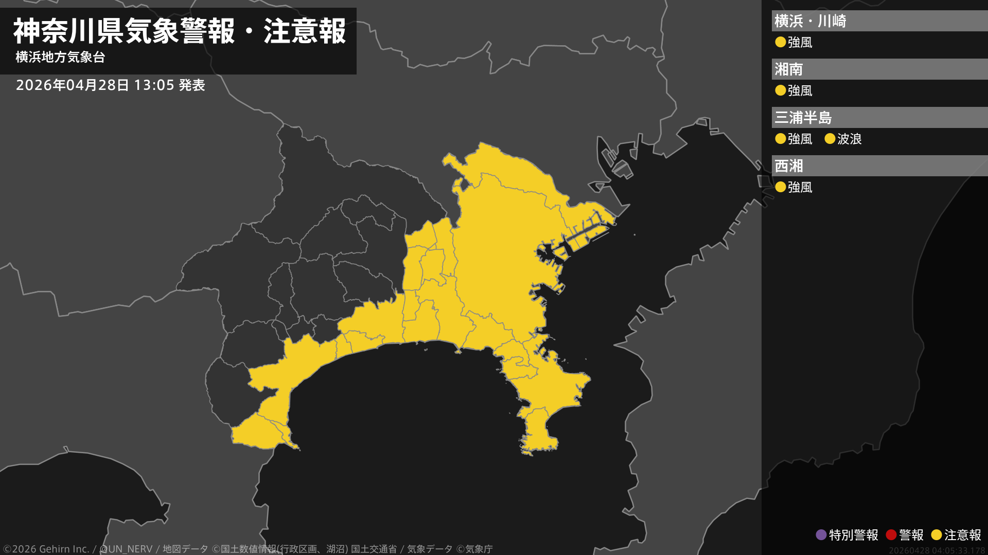 【神奈川県 気象警報・注意報 2026年04月28日 13:05】