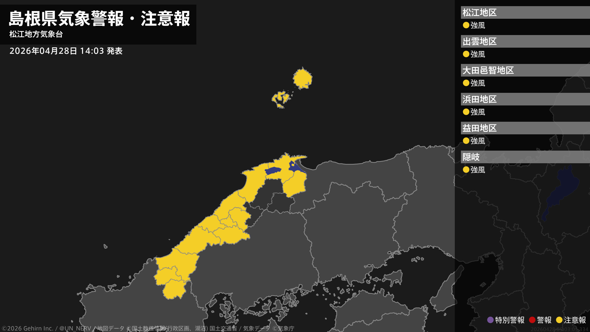 【島根県 気象警報・注意報 2026年04月28日 14:03】