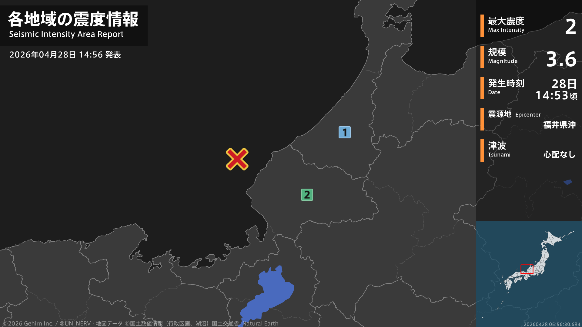 14時53分頃、福井県沖を震源とする地震がありました。震源の深さは約10km、地震の規模はM3.6、最大震度2を福井県で観測しています。この地震による津波の心配はありません。