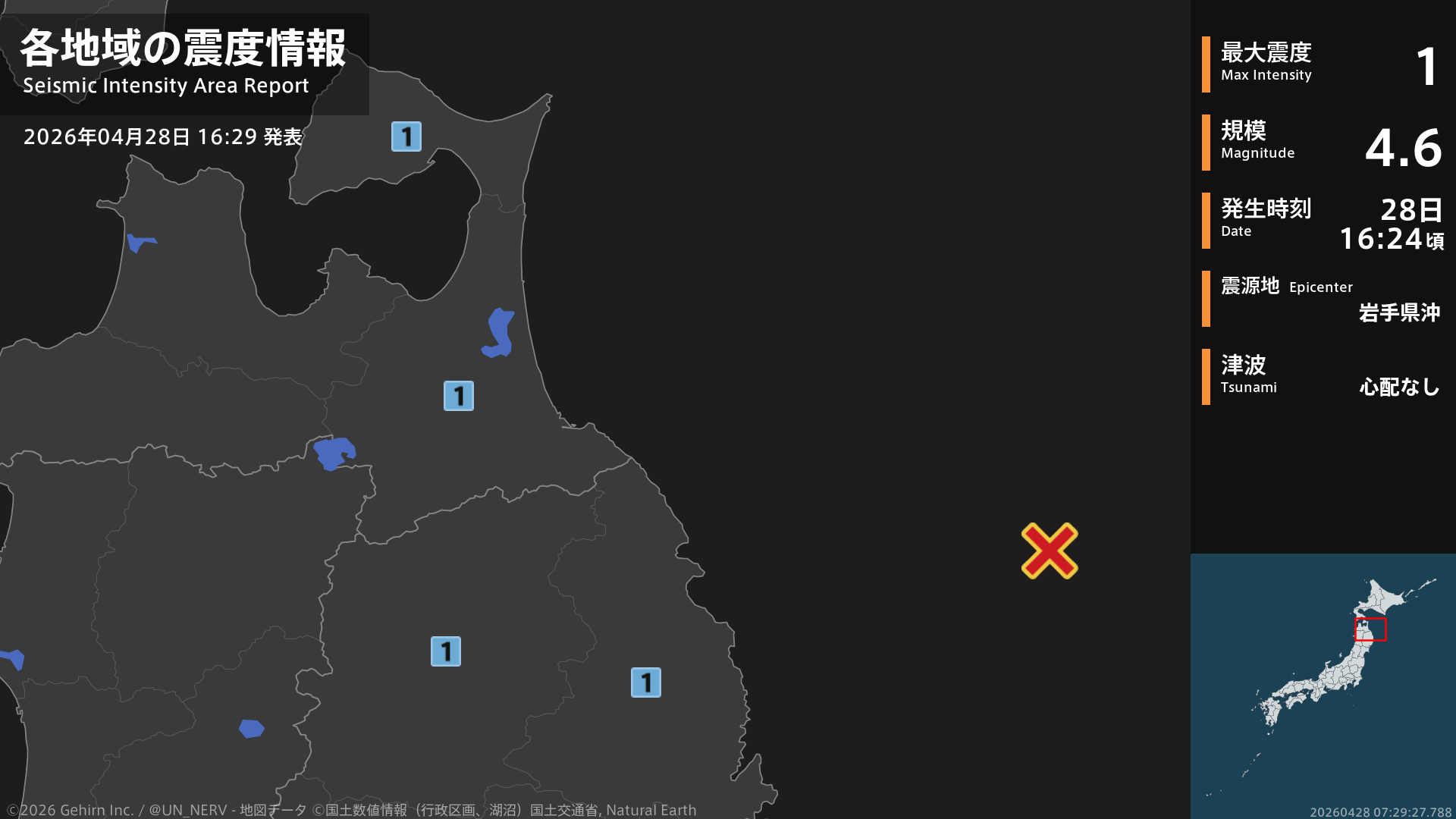 16時24分頃、岩手県沖を震源とする地震がありました。震源の深さはごく浅い、地震の規模はM4.6、最大震度1を青森県、岩手県で観測しています。この地震による津波の心配はありません。