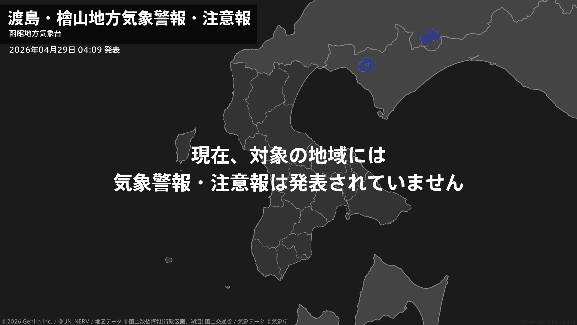 【渡島・檜山地方 気象警報・注意報 2026年04月29日 04:09】注意報を解除します。#気象警報注意報 #渡島地方 #檜山地方