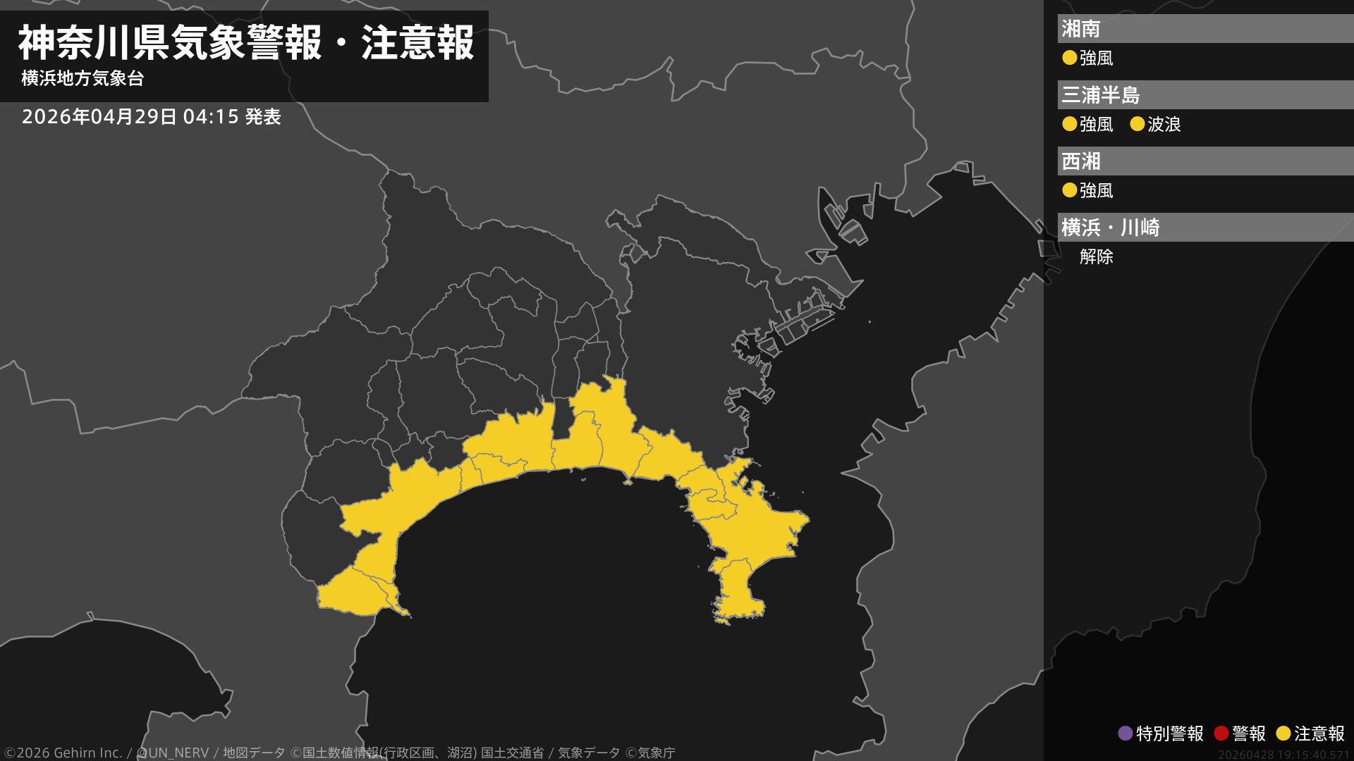 【神奈川県 気象警報・注意報 2026年04月29日 04:15】神奈川県では、29日昼前まで強風に注意してください。東部では、29日昼前まで高波に注意してください。#気象警報注意報 #神奈川県